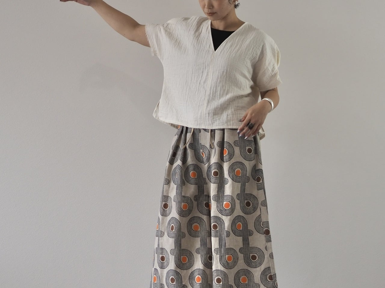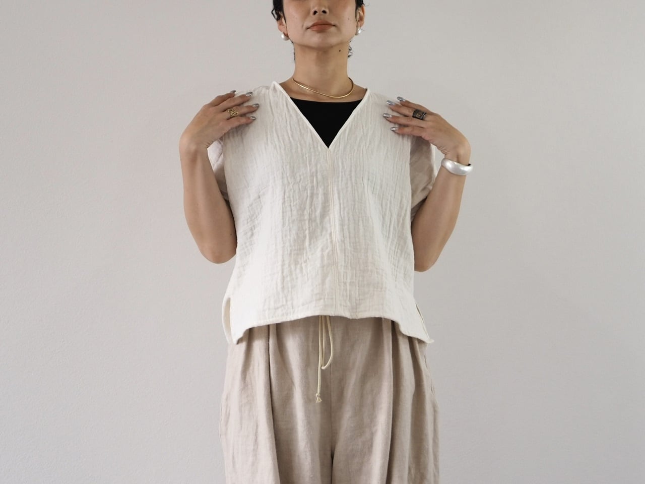 新作、トリプルガーゼで作ったやわらかな肌ざわりのVネックトップス。