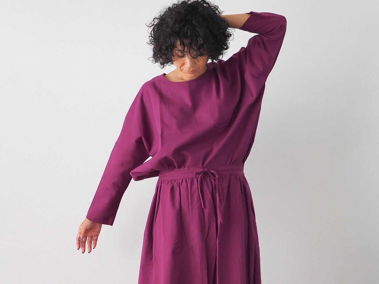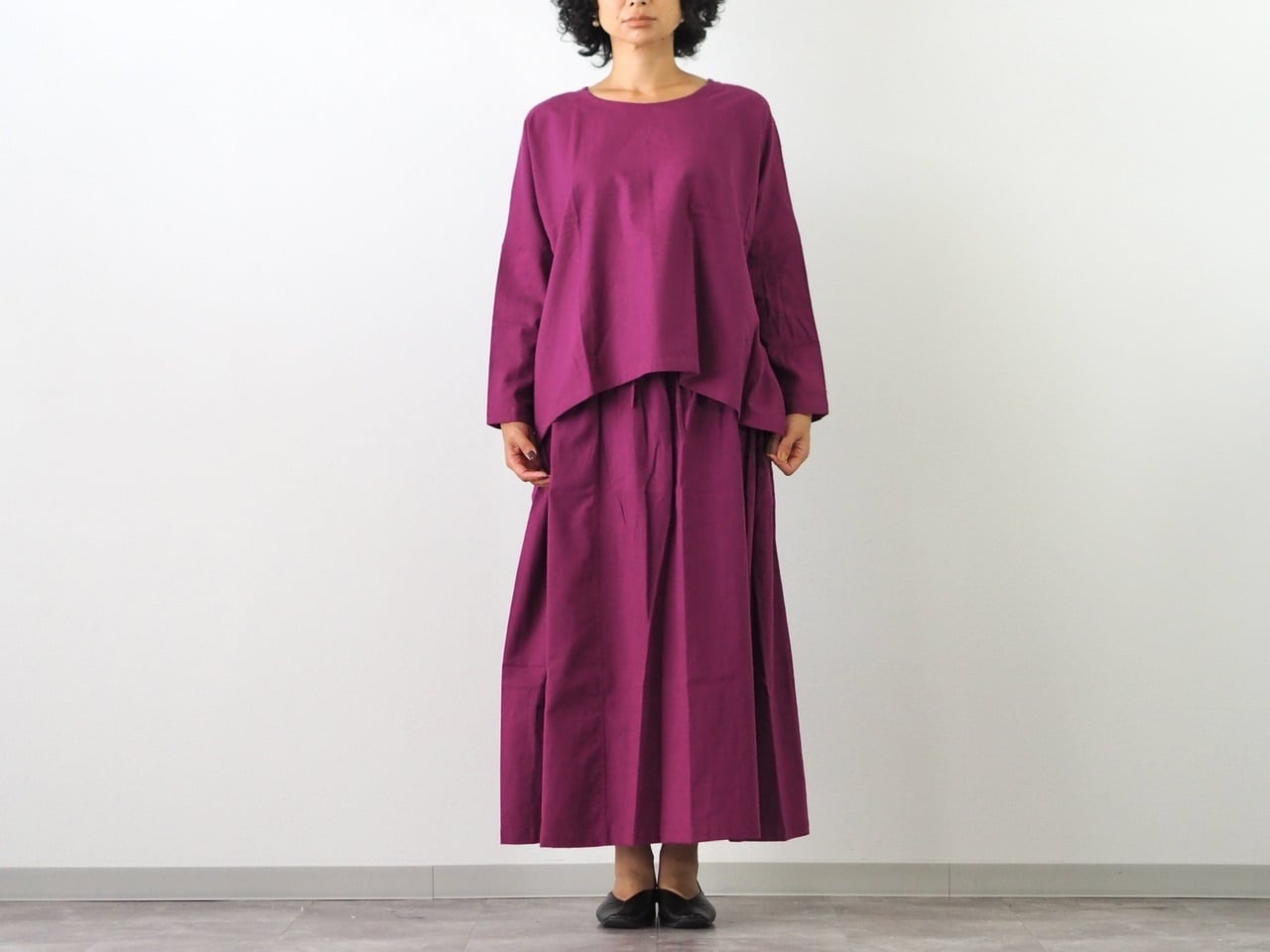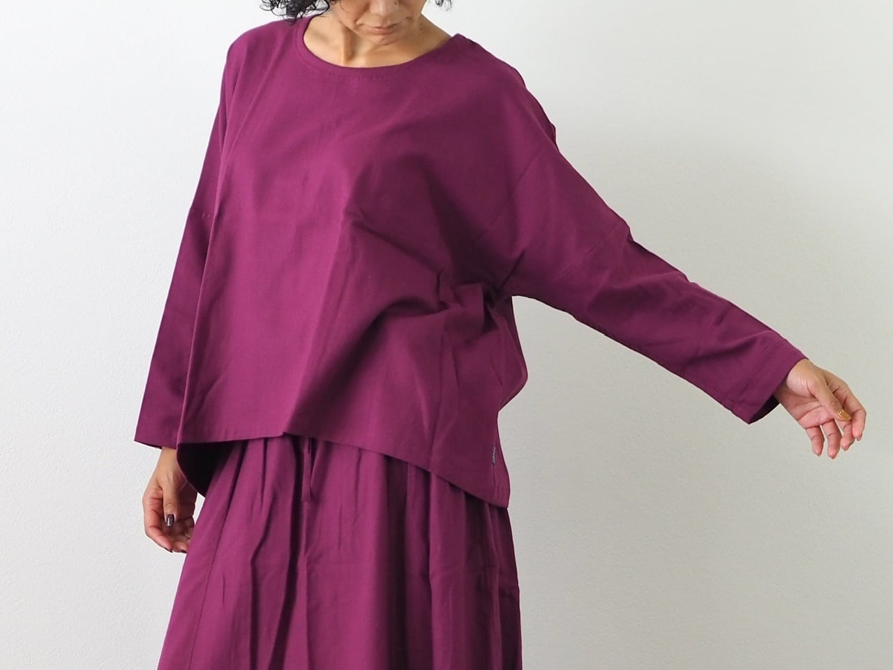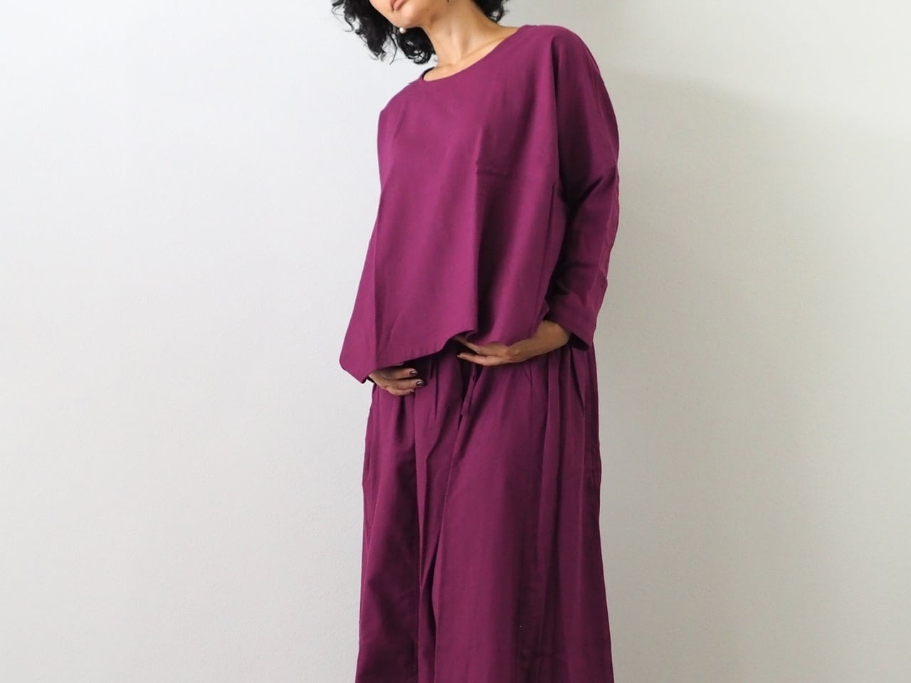 裾が左右下がるデザインで、動作に沿う、ゆったりとしたシルエットになっています。セットで着れる同素材のスカートと揃えて、色々な着こなしが楽しめます。