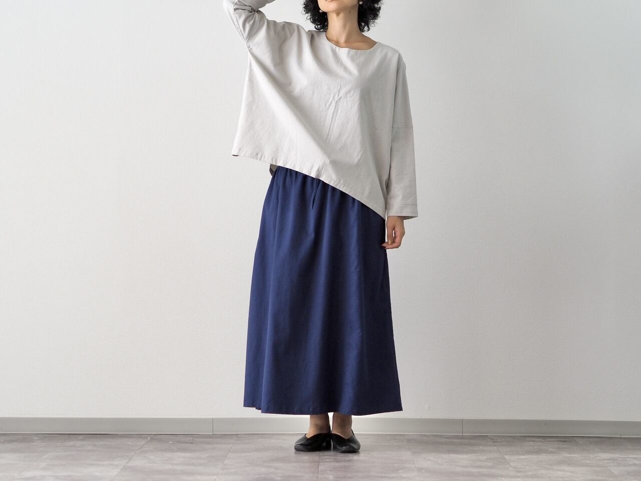 こちらのスカートと同素材のトップスは秋口〜春先まで、色違いでのリピートが多い定番人気のアイテムです。やわらかな肌触りで厚ぼったくなく軽い着心地の為、春夏はガーゼのトップスがお好きな方に、とてもご好評頂いています。