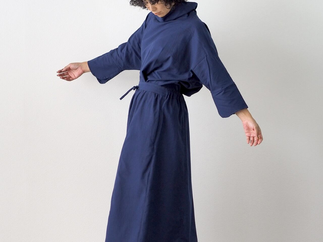 起毛コットンで作った四枚ハギのフレアスカート。着回しの効くネイビー。セットアップでは他のお色と合わせて着るのもおすすめです。シンプルで長くご愛用頂けるスタイルです。左サイドには内ポケットも付いています。