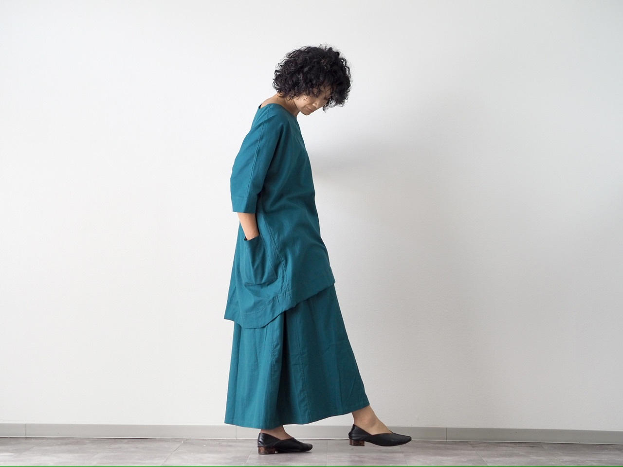 起毛コットンで作った四枚ハギのフレアスカート。深みのあるピーコックグリーン。落ち着きと、華やかさを合わせ持つお色です。セットアップでは他のお色と合わせて着るのもおすすめです。シンプルで長くご愛用頂けるスタイルです。左サイドには内ポケットも付いています。