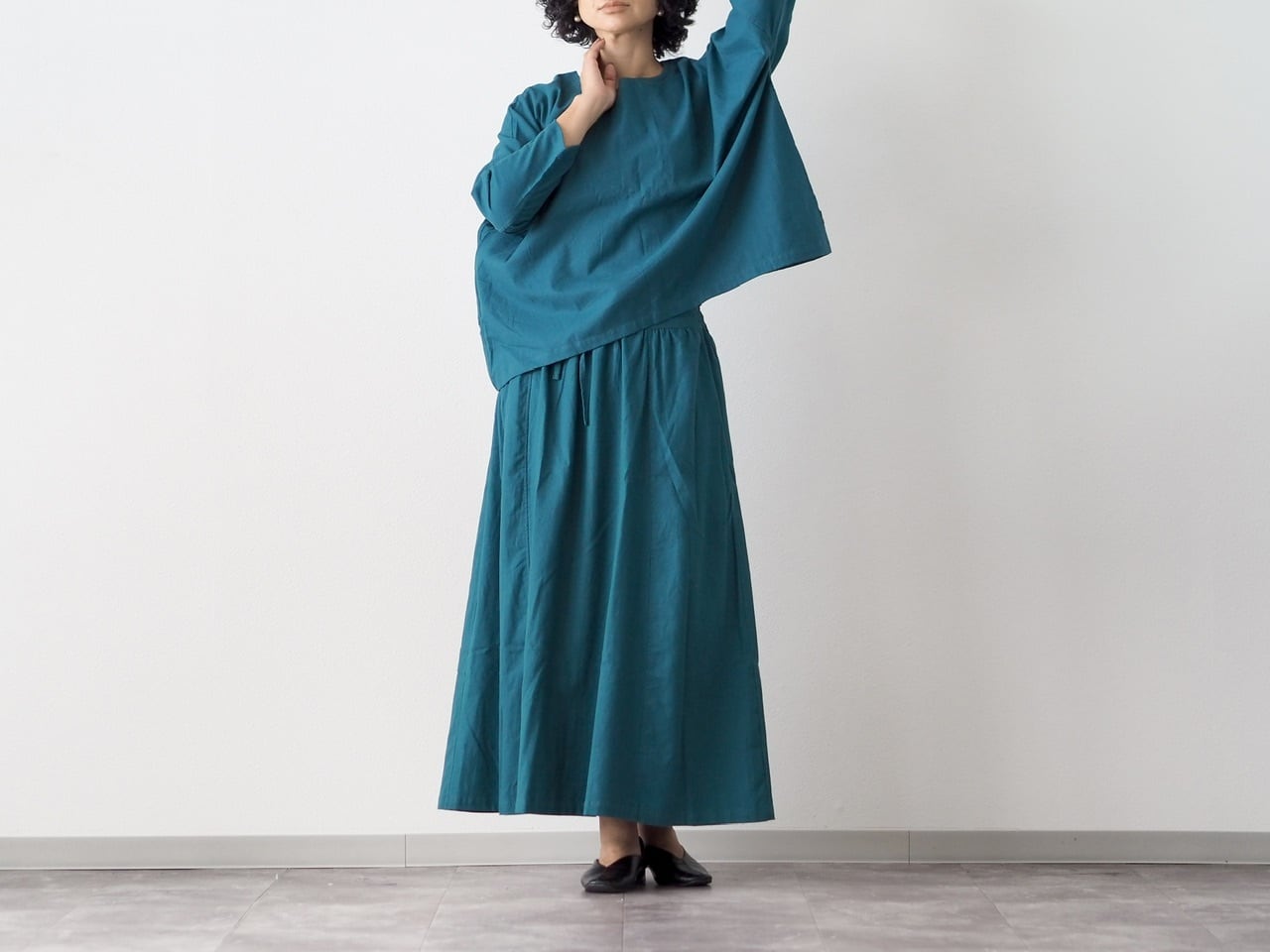 こちらのスカートと同素材のトップスは秋口〜春先まで、色違いでのリピートが多い定番人気のアイテムです。やわらかな肌触りで厚ぼったくなく軽い着心地の為、春夏はガーゼのトップスがお好きな方に、とてもご好評頂いています。