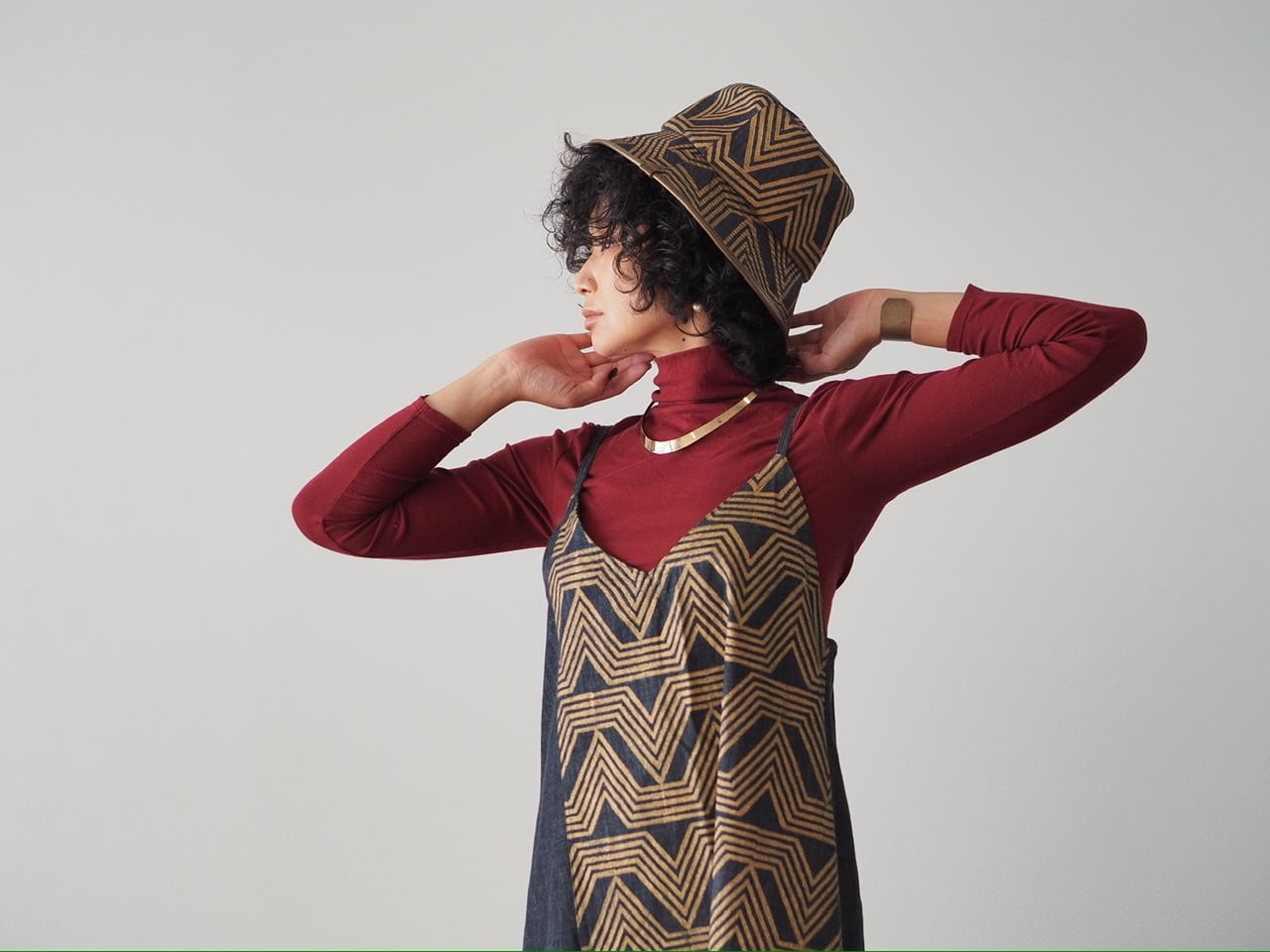 デニム生地にゴールドの幾何学文様が浮かび上がる、バケットハット。