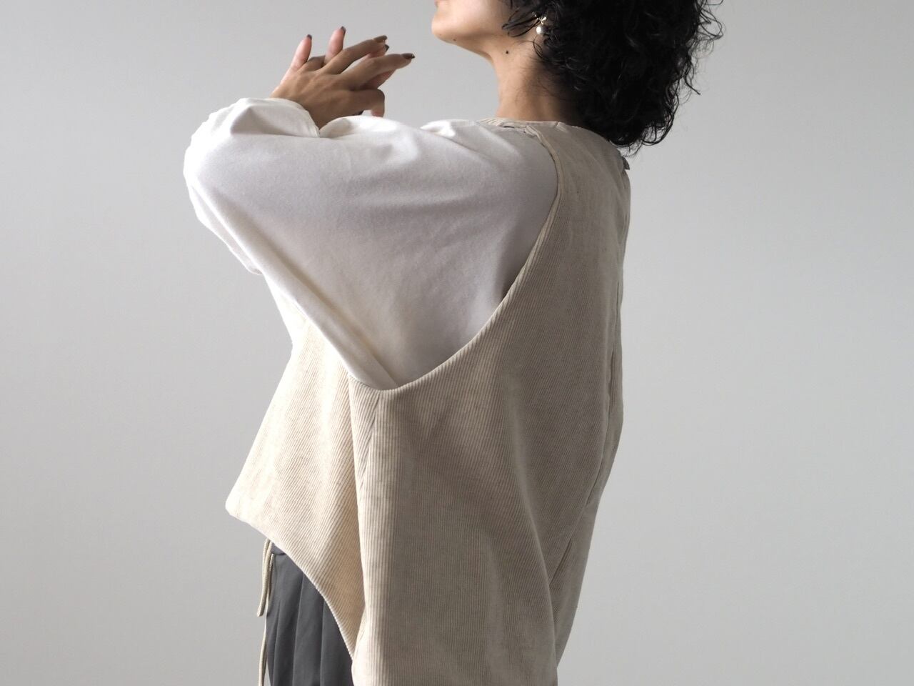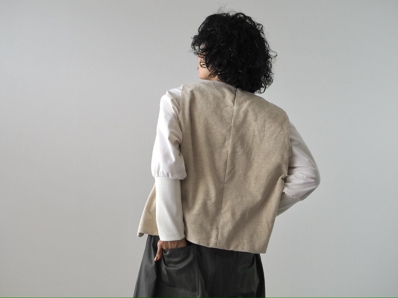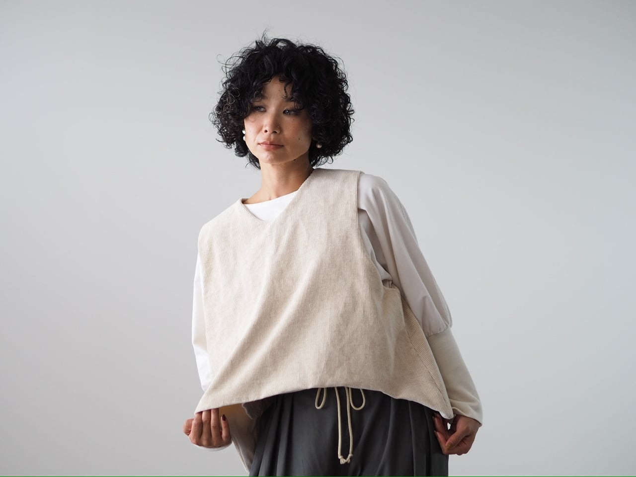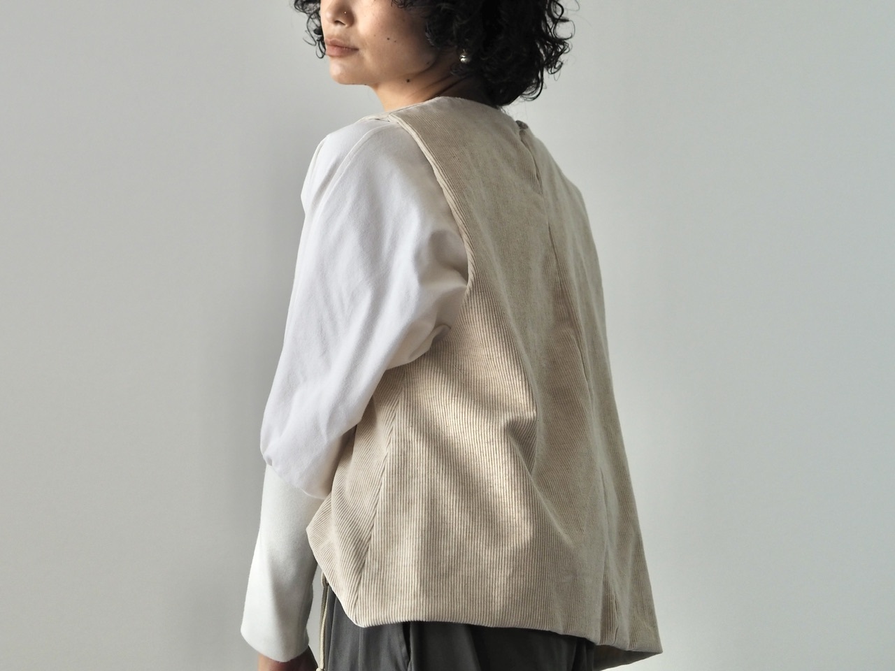 リネン混の保温効果の高いコーデュロイで作ったゆったりとしたベスト。