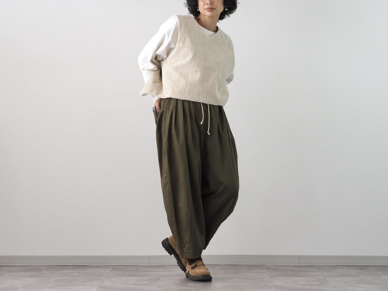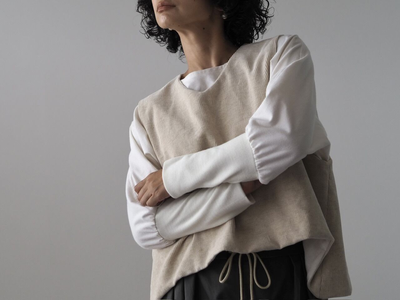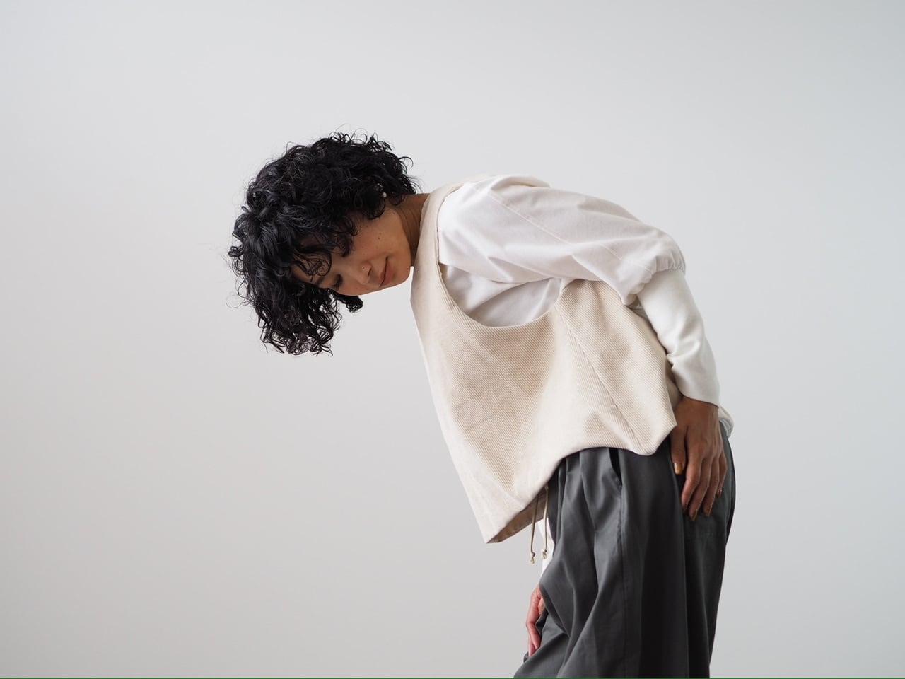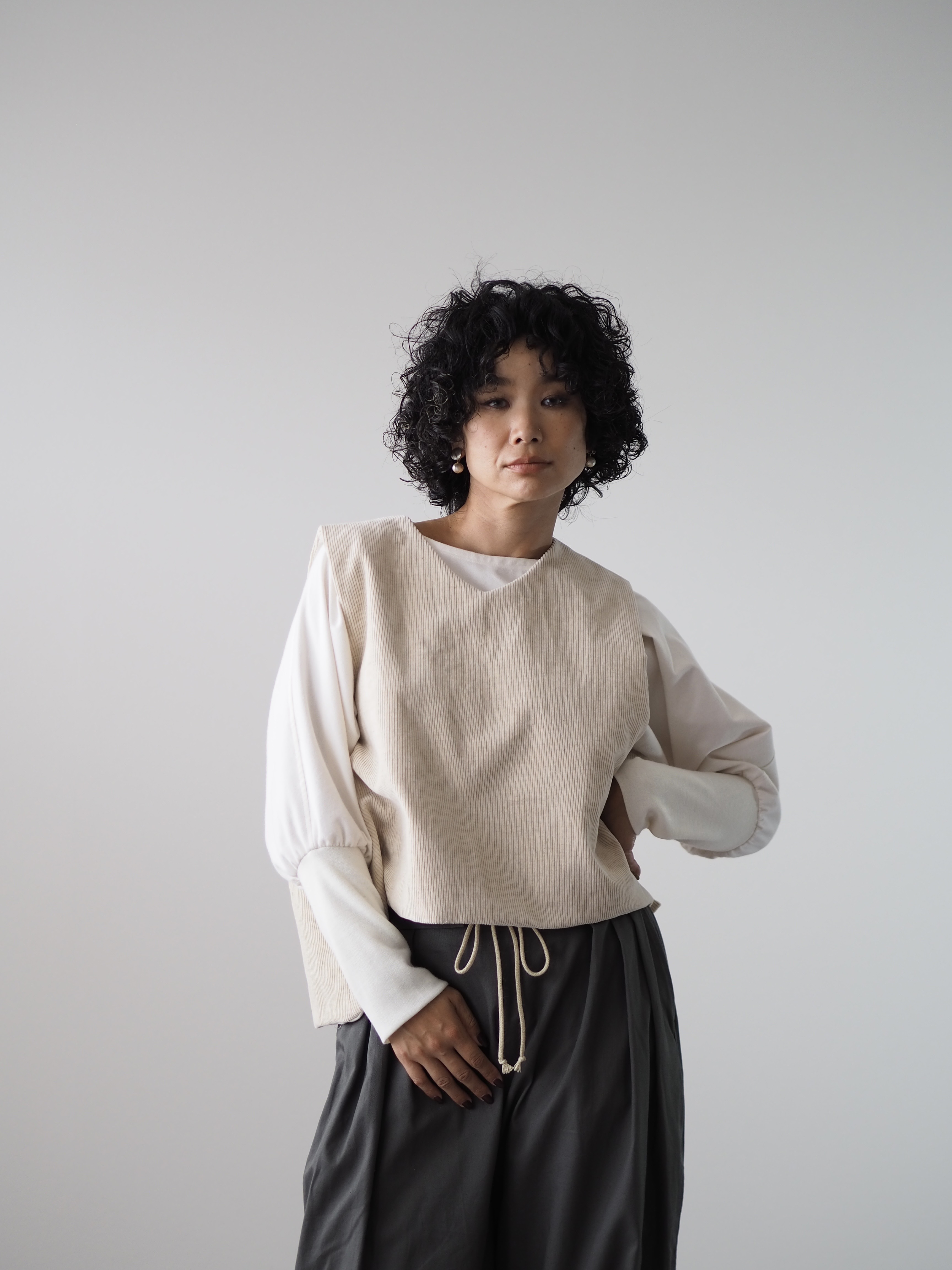 リネン混の保温効果の高いコーデュロイで作ったゆったりとしたベスト。