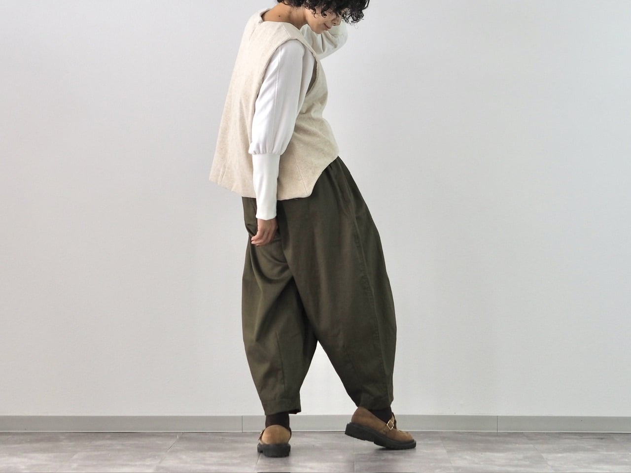 お袖周りも広く開いていますので、色々なトップスやワンピースの上から重ねて、自由に組み合わせが可能です。パンツスタイルやロングスカートとの組み合わせもおすすめです。一枚あるととても重宝するアイテムです。
