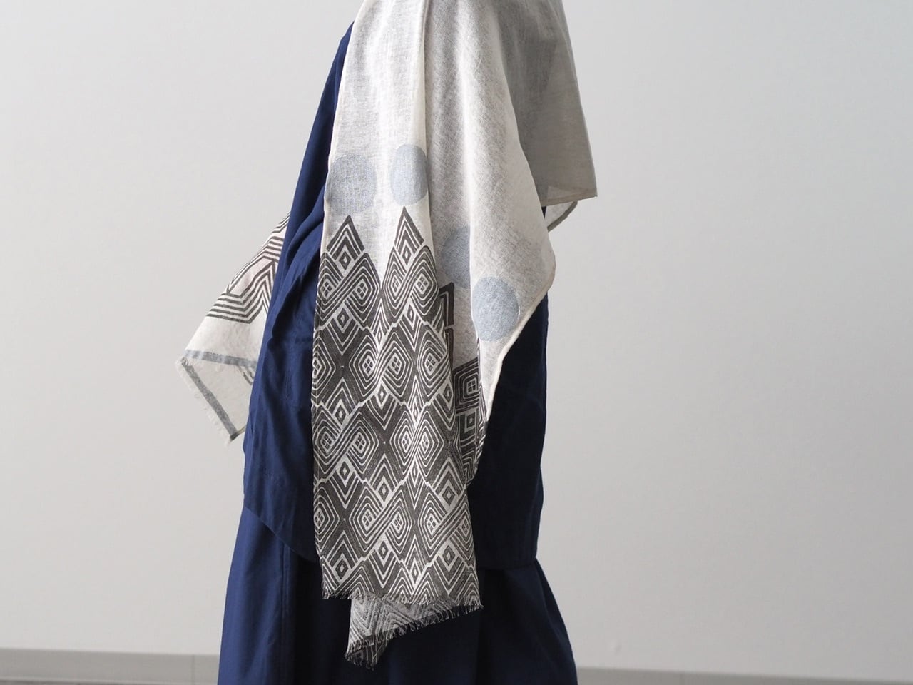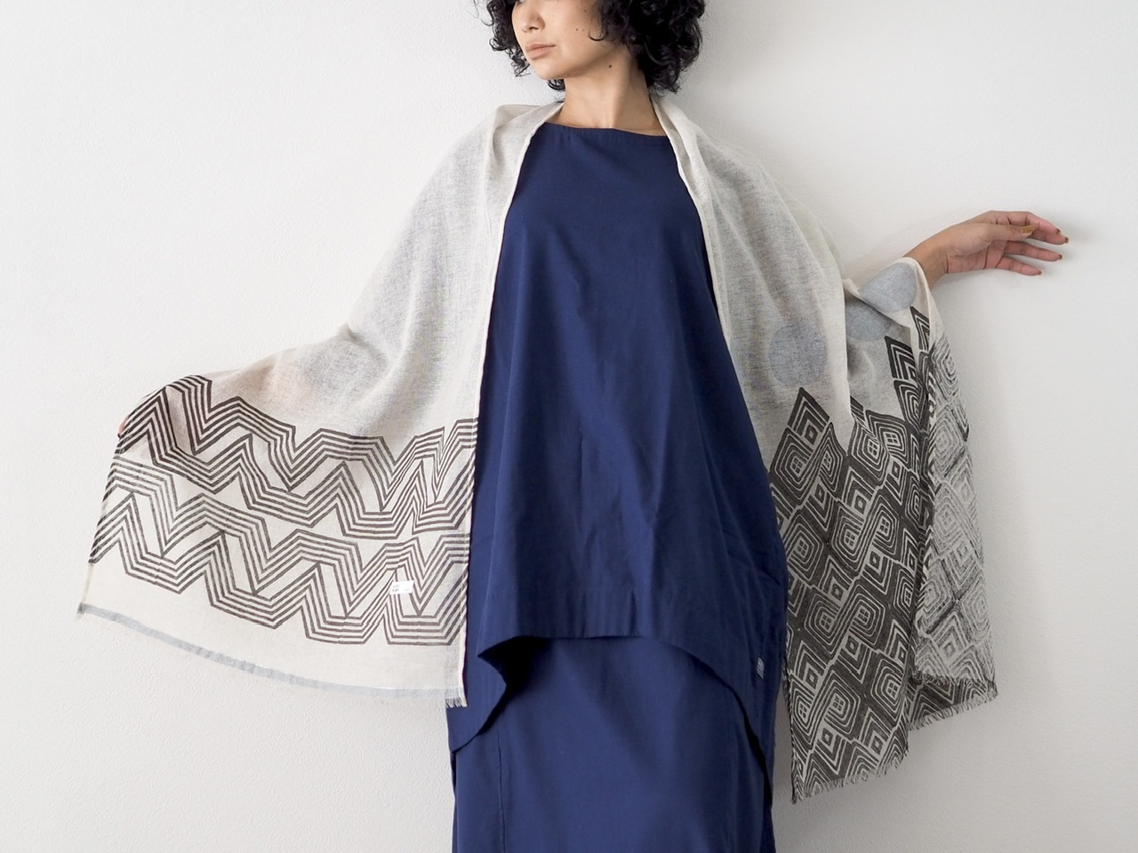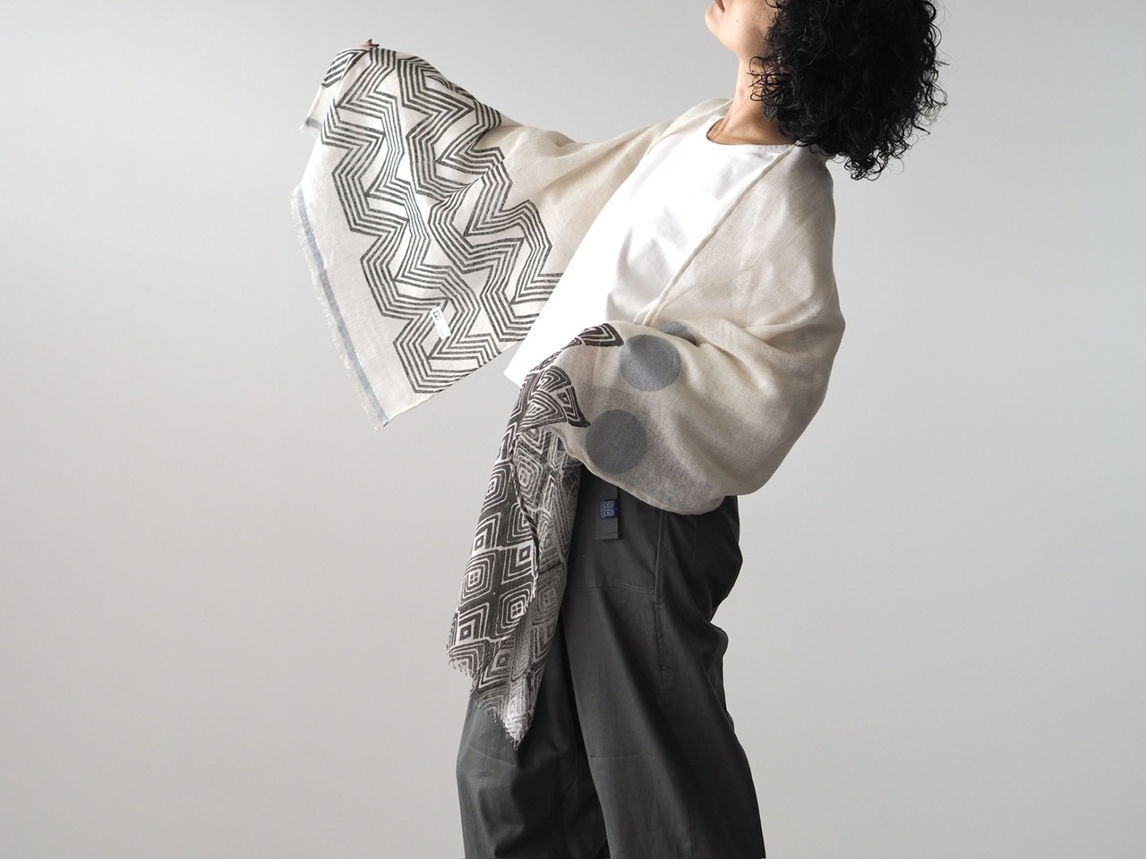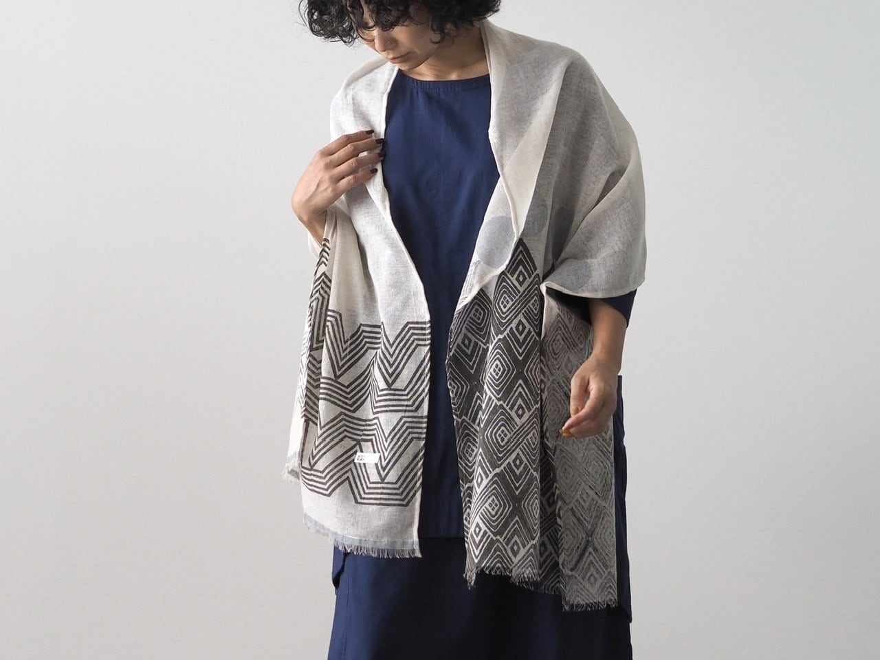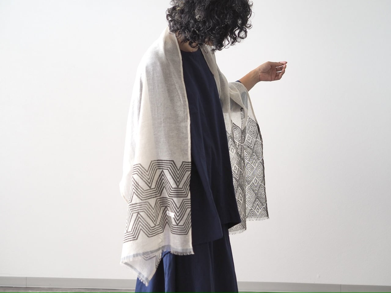 丈200cm、幅53cmとかなり大判ですので、巻いたり、纏ったりとアレンジがたのしめます。最初はハリがありますが、洗いをかけるほどふわっと肌馴染み良く変化していきます。左右非対称なデザインとなっていますので、巻き方により違う印象になります。