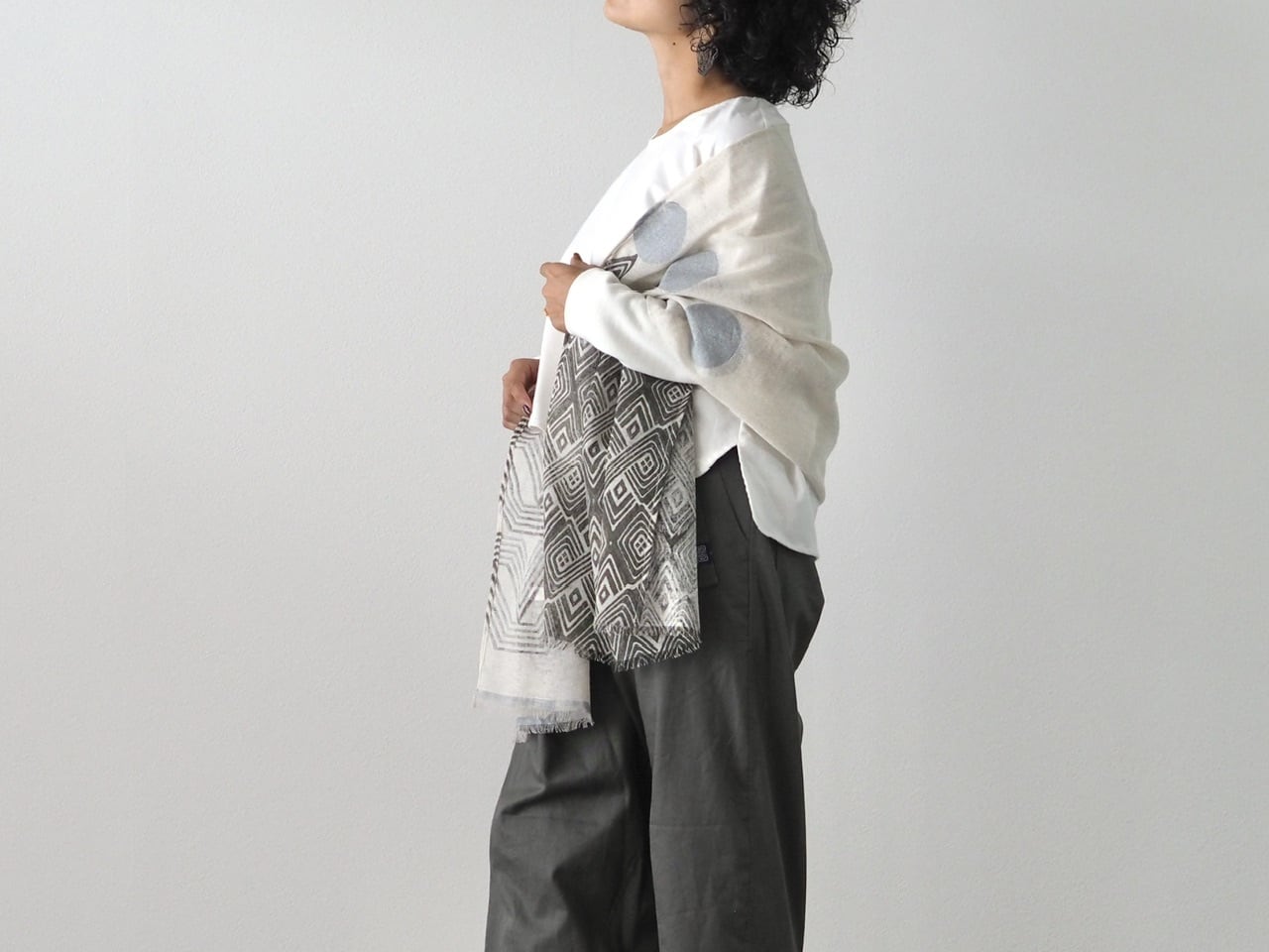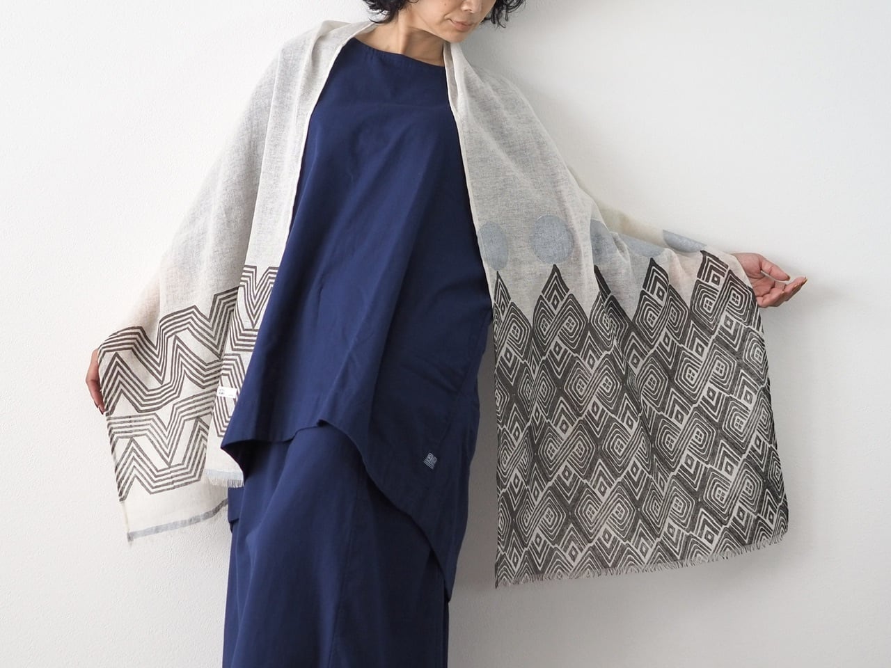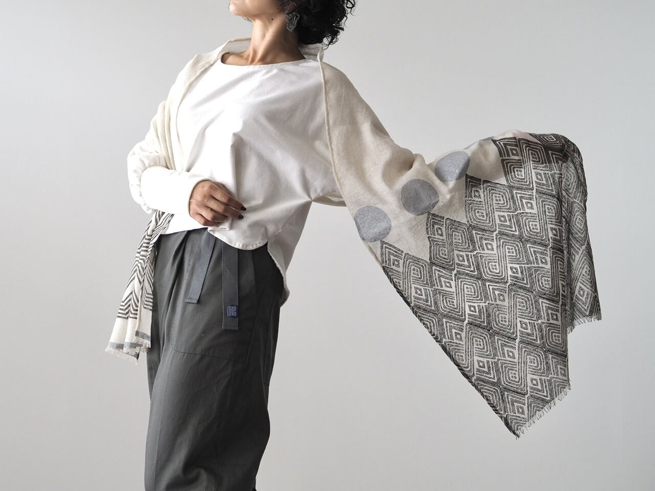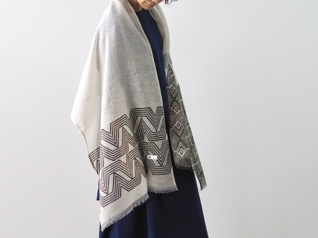 丈200cm、幅53cmとかなり大判ですので、巻いたり、纏ったりとアレンジがたのしめます。最初はハリがありますが、洗いをかけるほどふわっと肌馴染み良く変化していきます。左右非対称なデザインとなっていますので、巻き方により違う印象になります。