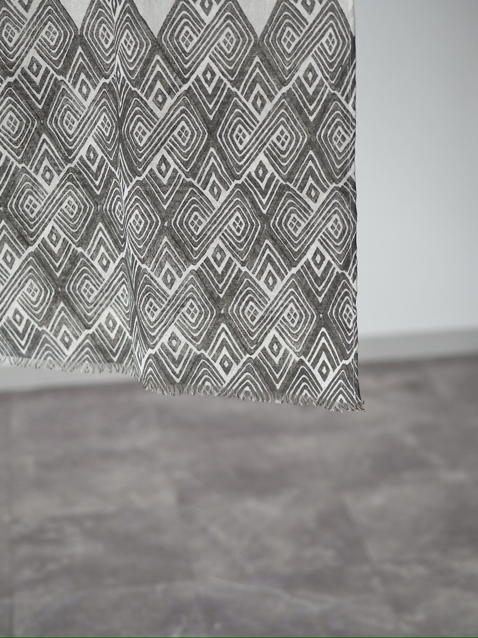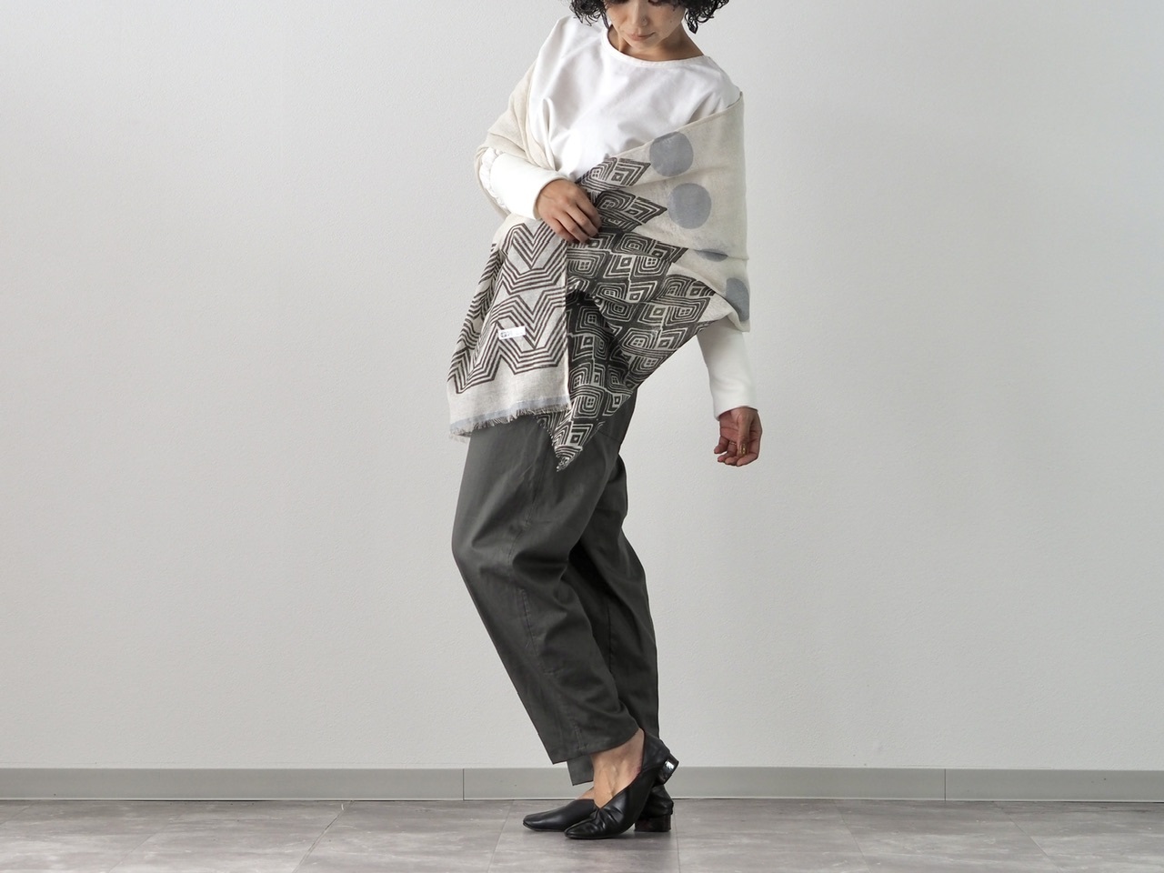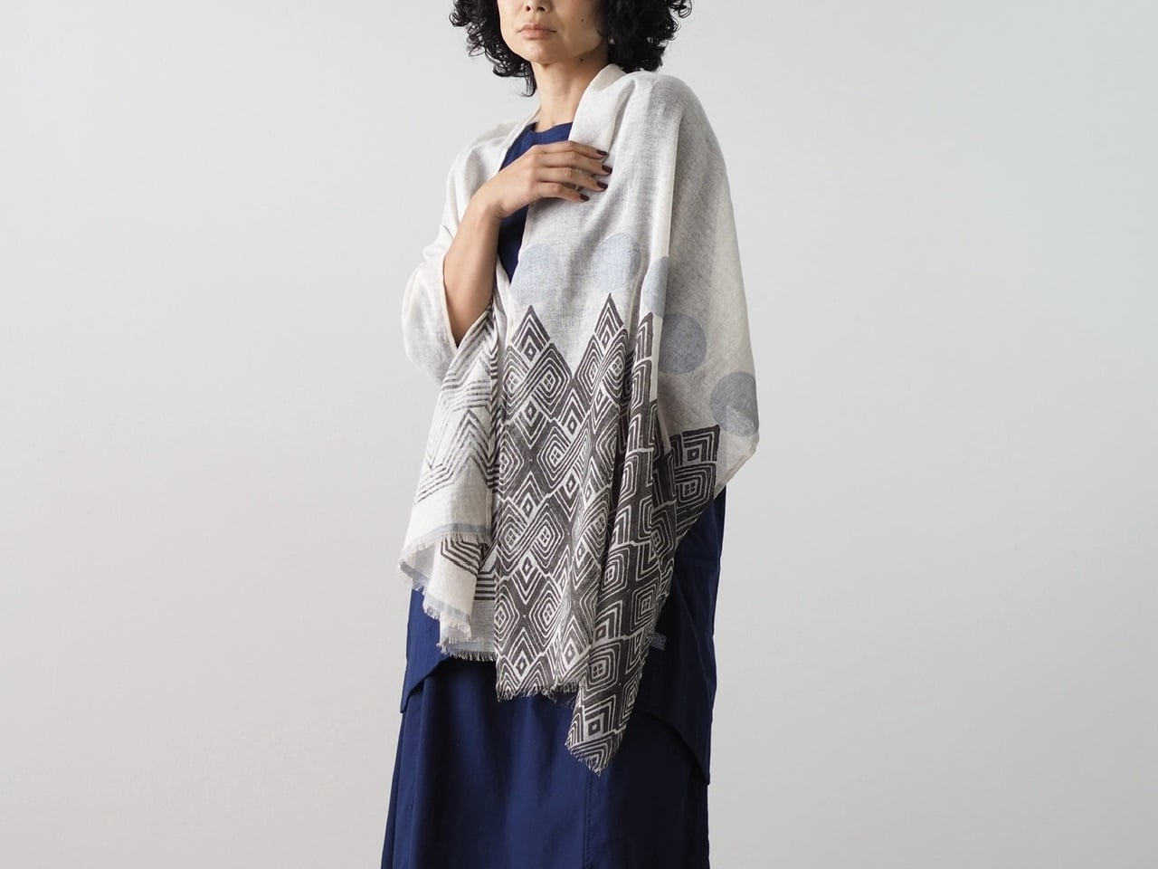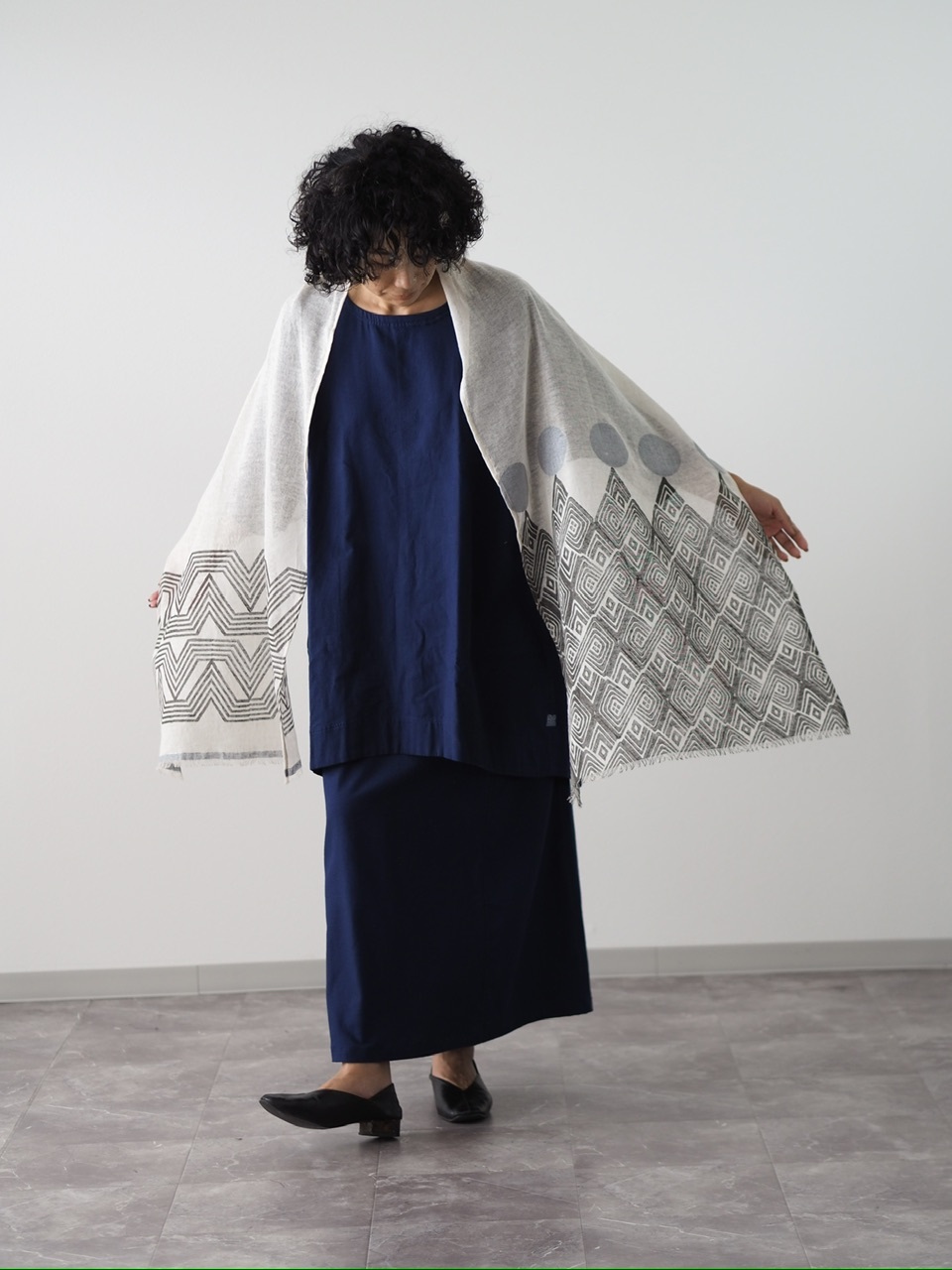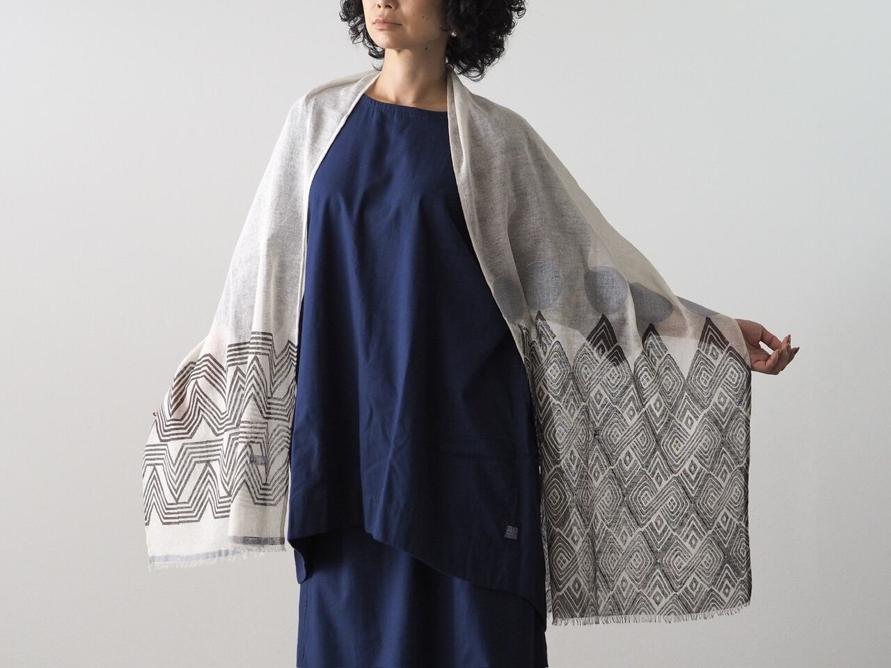 丈200cm、幅53cmとかなり大判ですので、巻いたり、纏ったりとアレンジがたのしめます。最初はハリがありますが、洗いをかけるほどふわっと肌馴染み良く変化していきます。左右非対称なデザインとなっていますので、巻き方により違う印象になります。