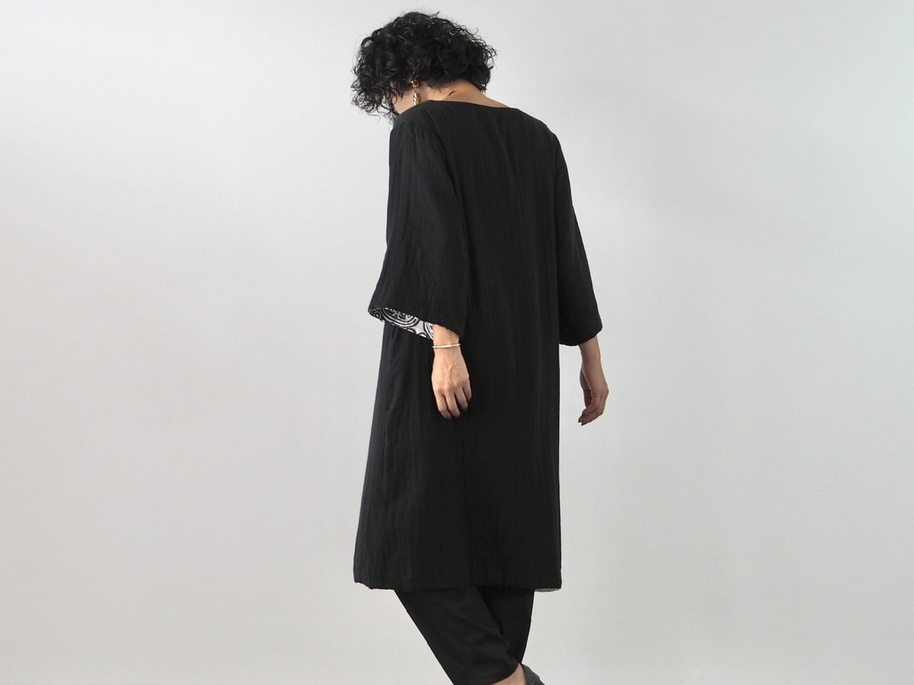 キナリ色のトリプルガーゼのお袖とポケットにブロックプリントで文様を施しました。裏面はブラックのダブルガーゼとなっています。ブラックは無地でシンプルに着ることもできますし、お袖だけ折り返して文様を見せるとアクセントになります。