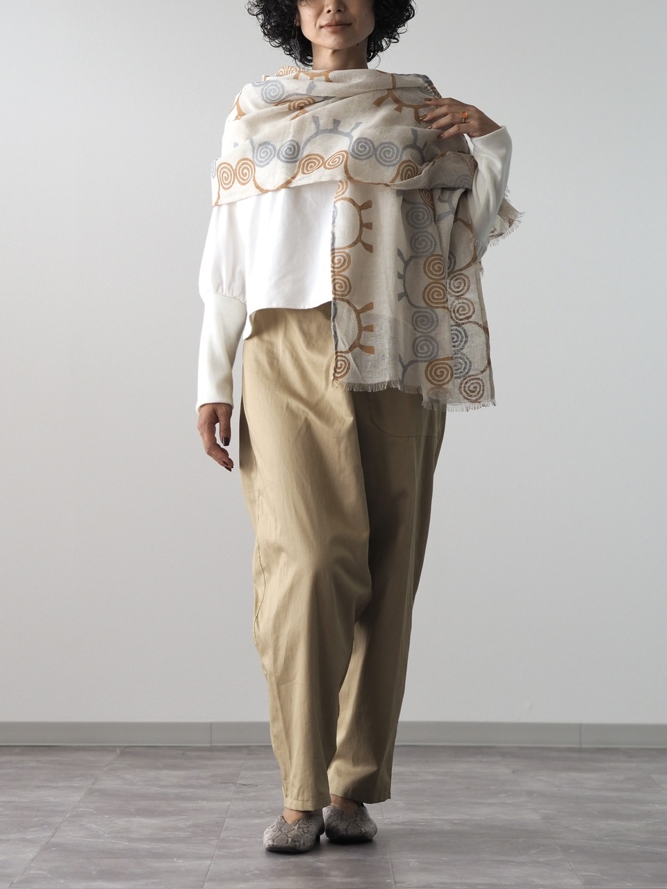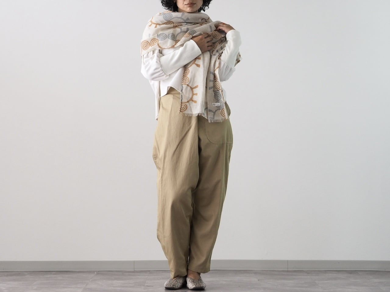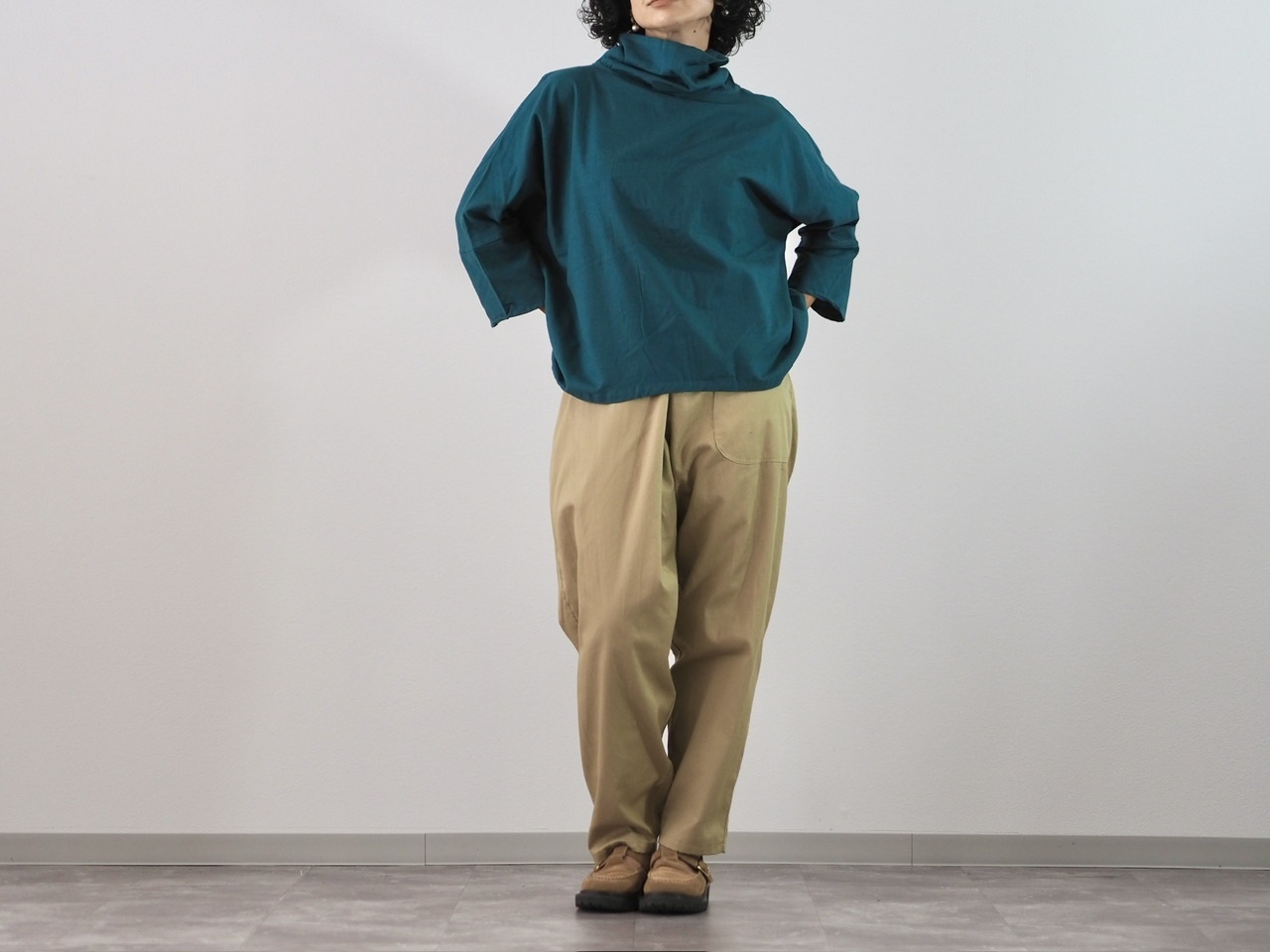 裾にいくほど細っそりとしたシルエットなので、チュニックの下に穿いてもスッキリ。↑