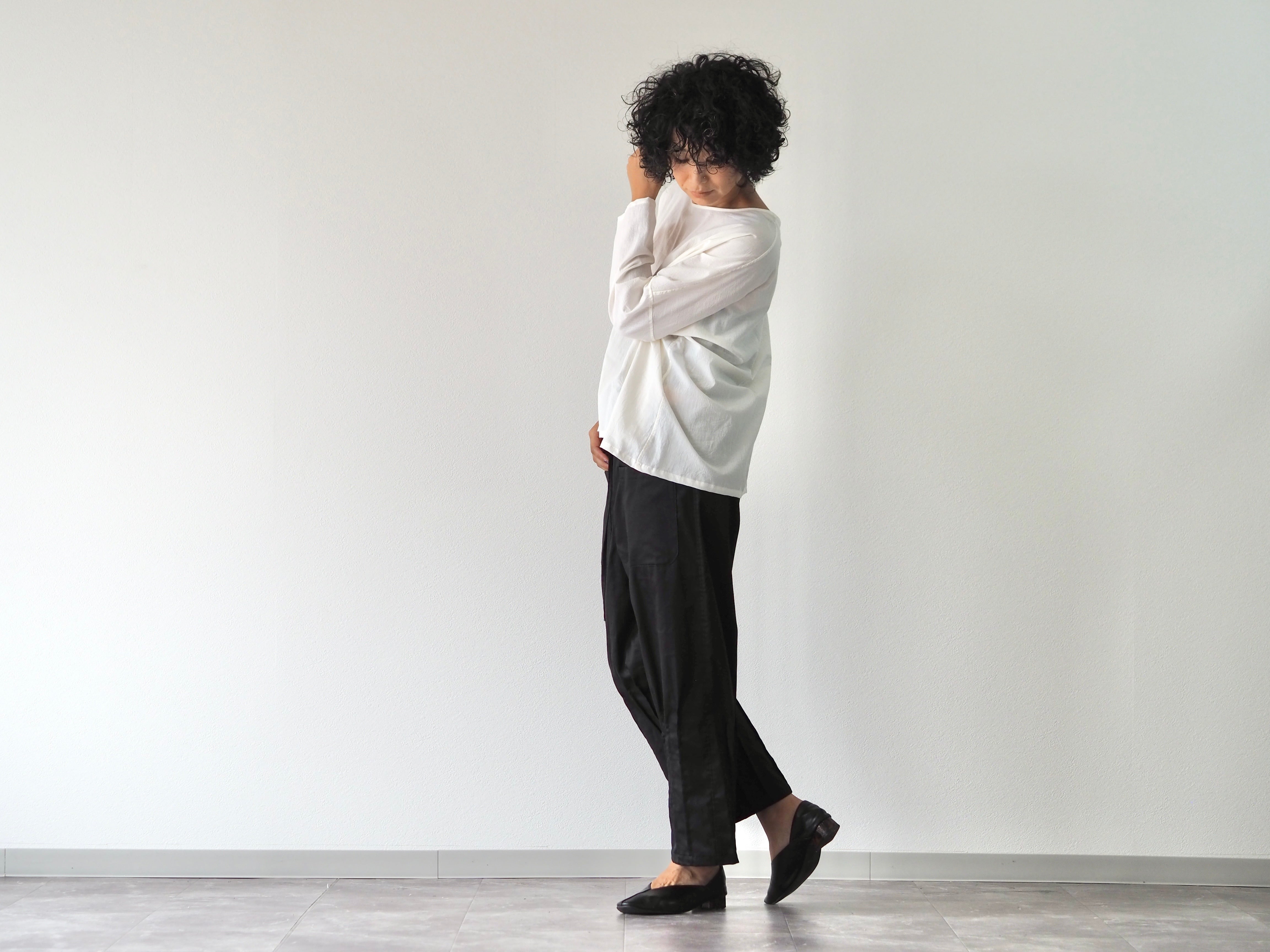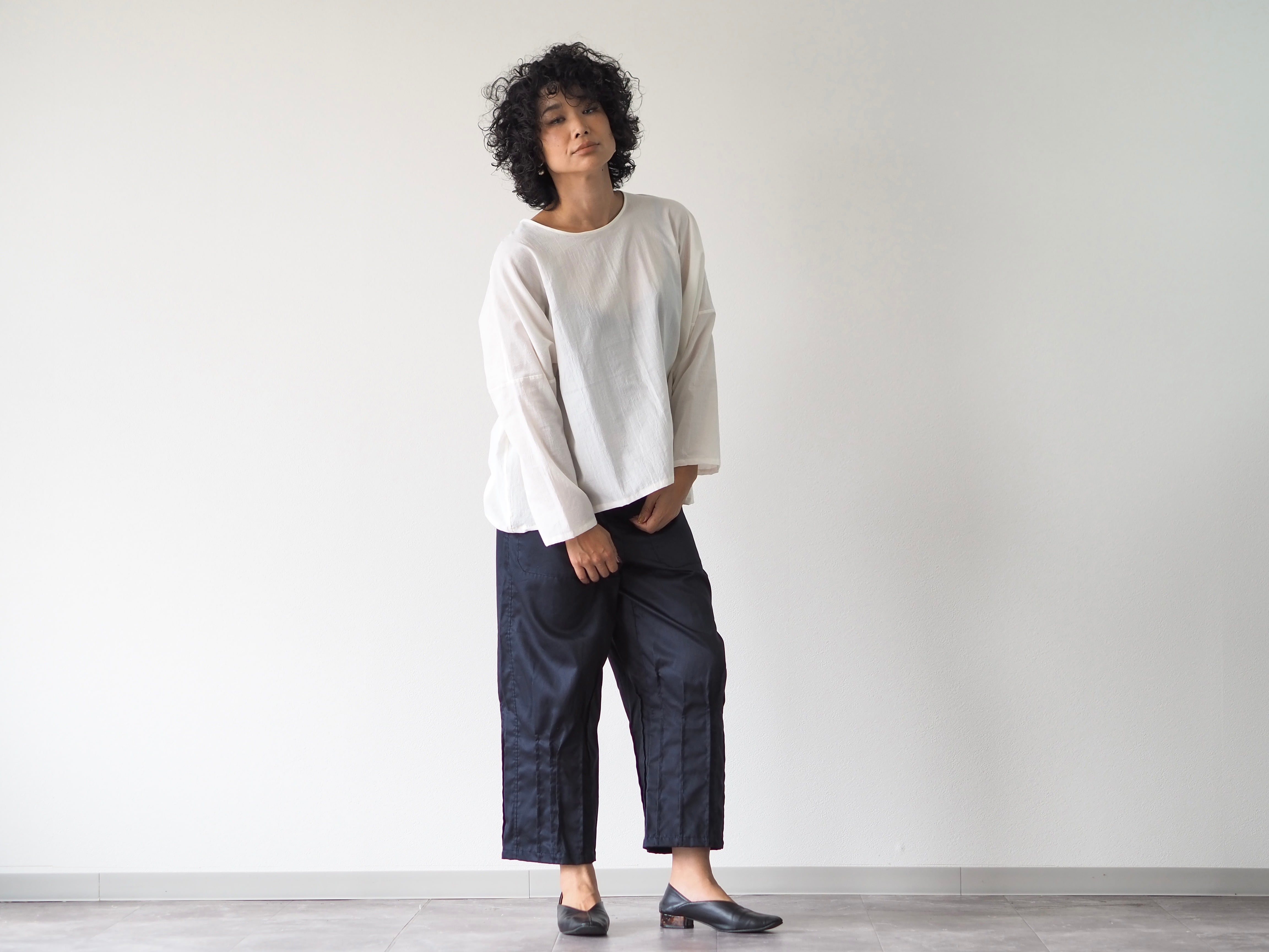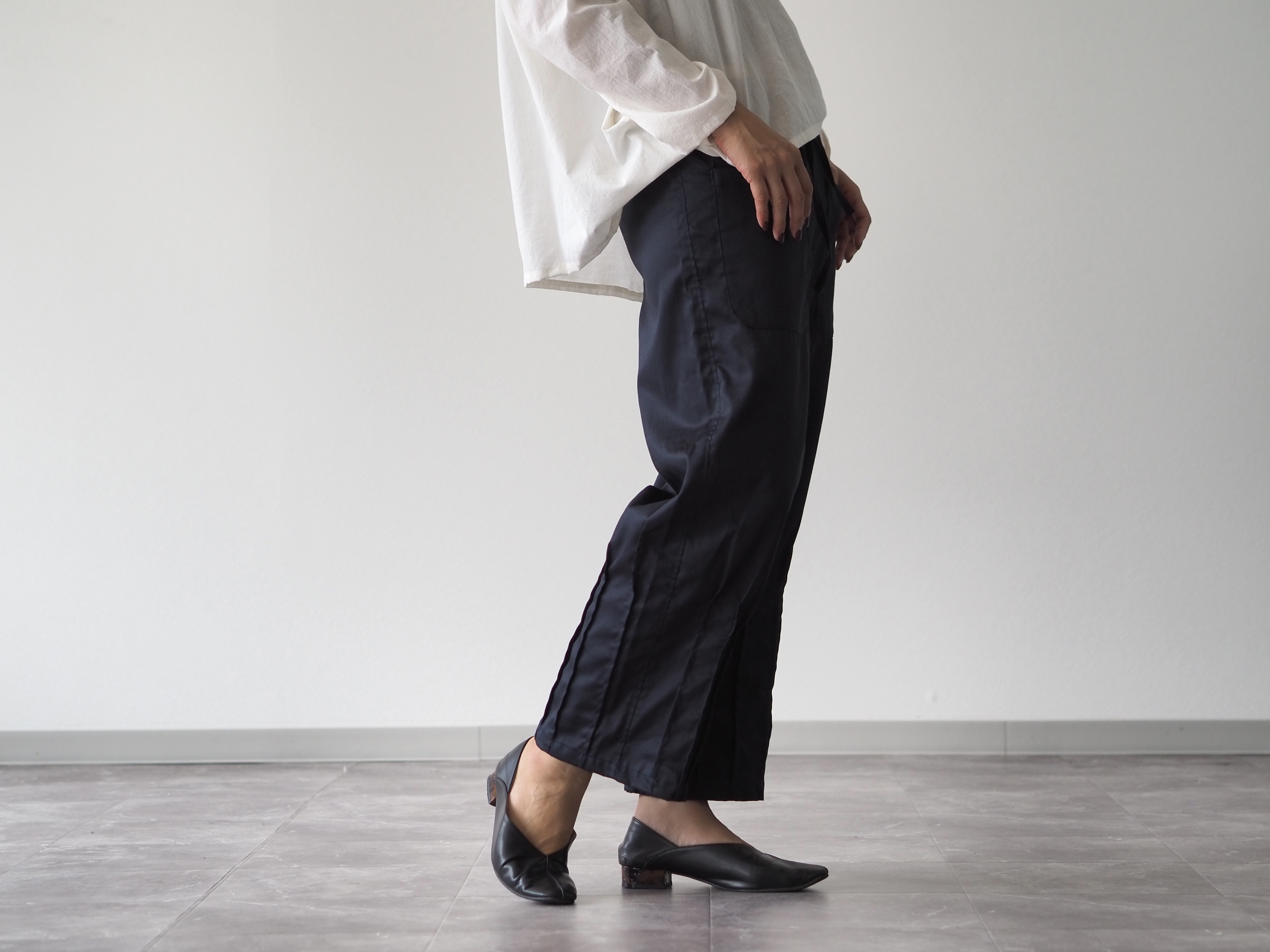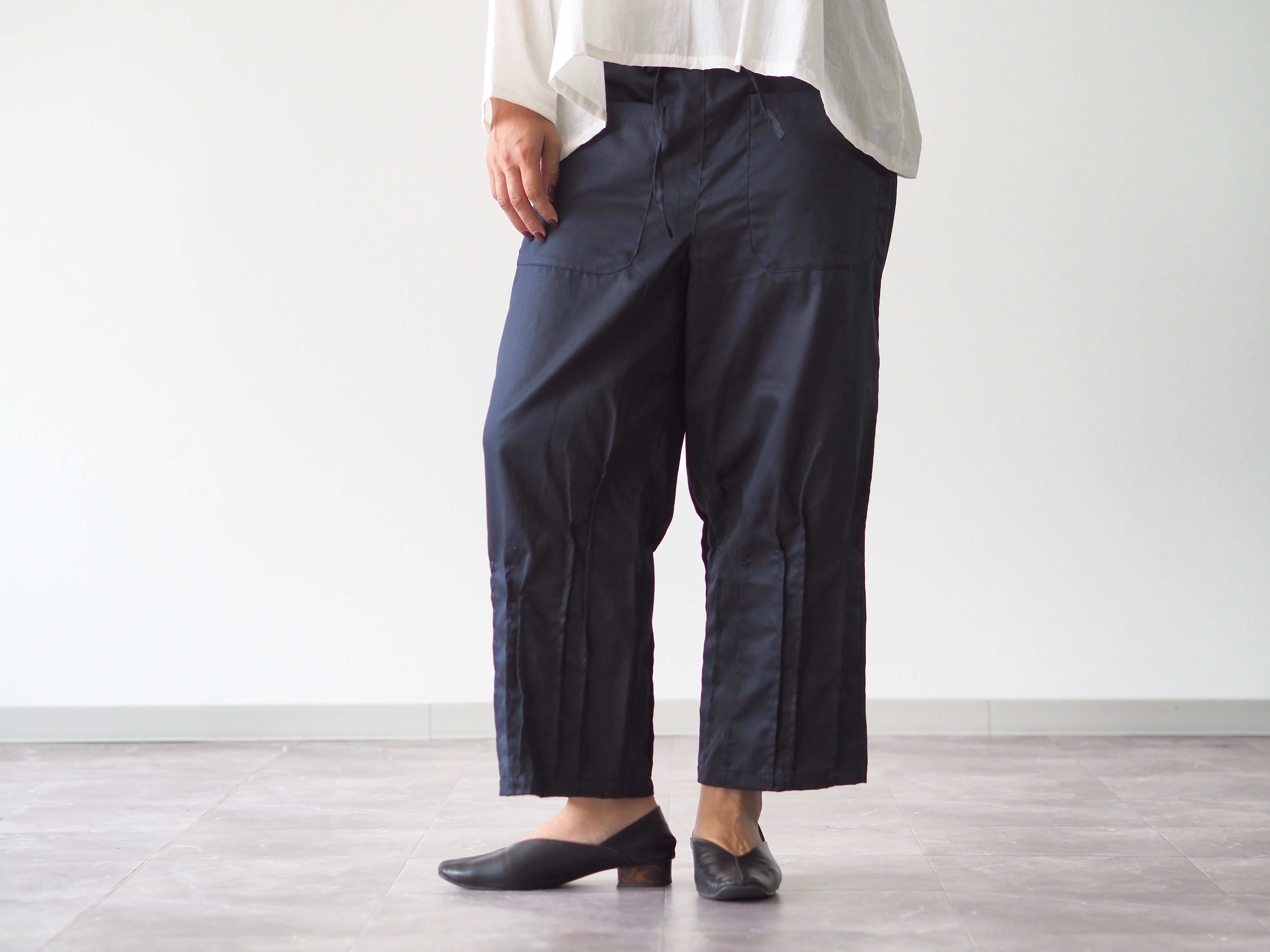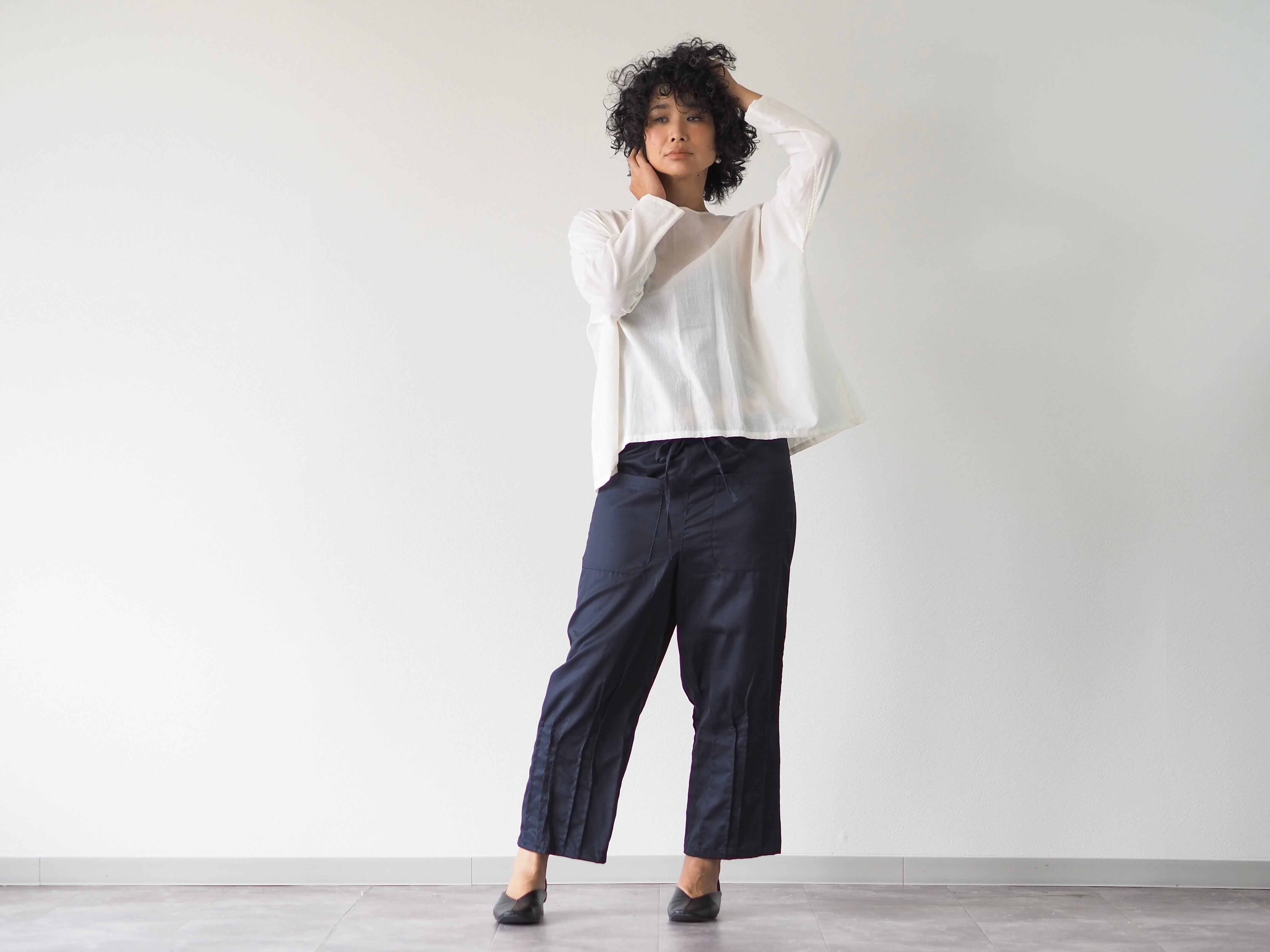 サラッと光沢のあるコットンサテンで作った、裾にピンタックが入ったパンツ。