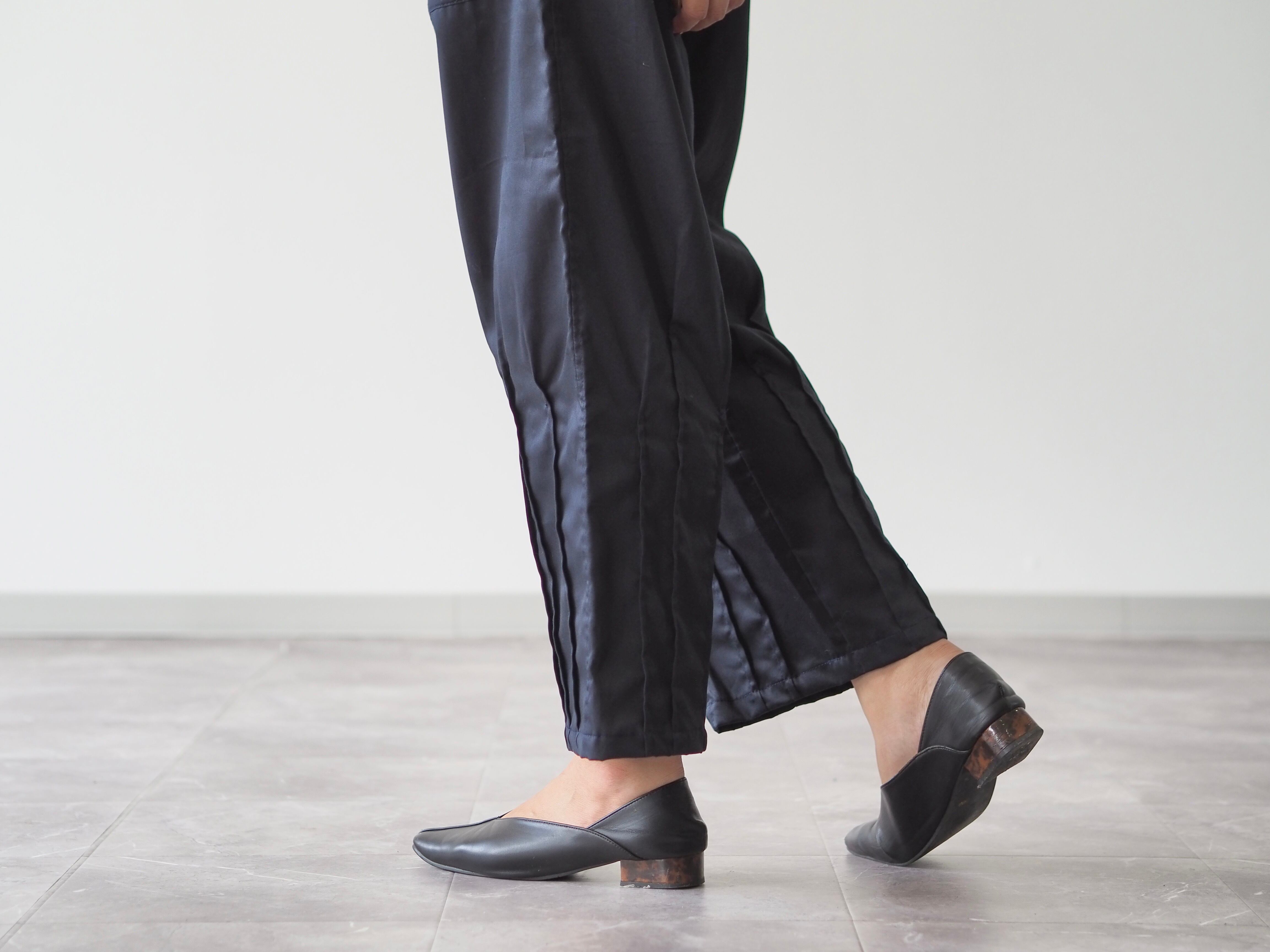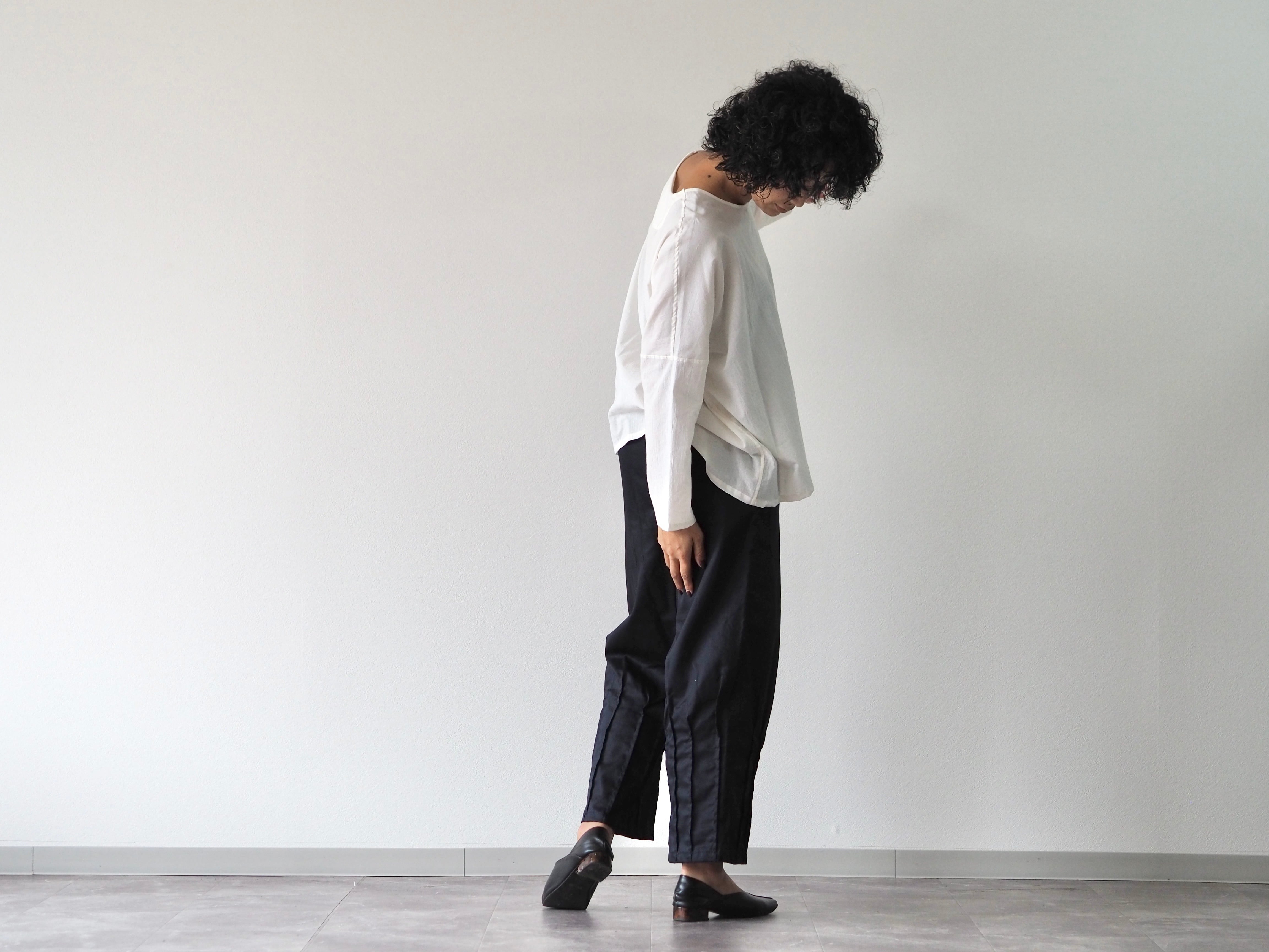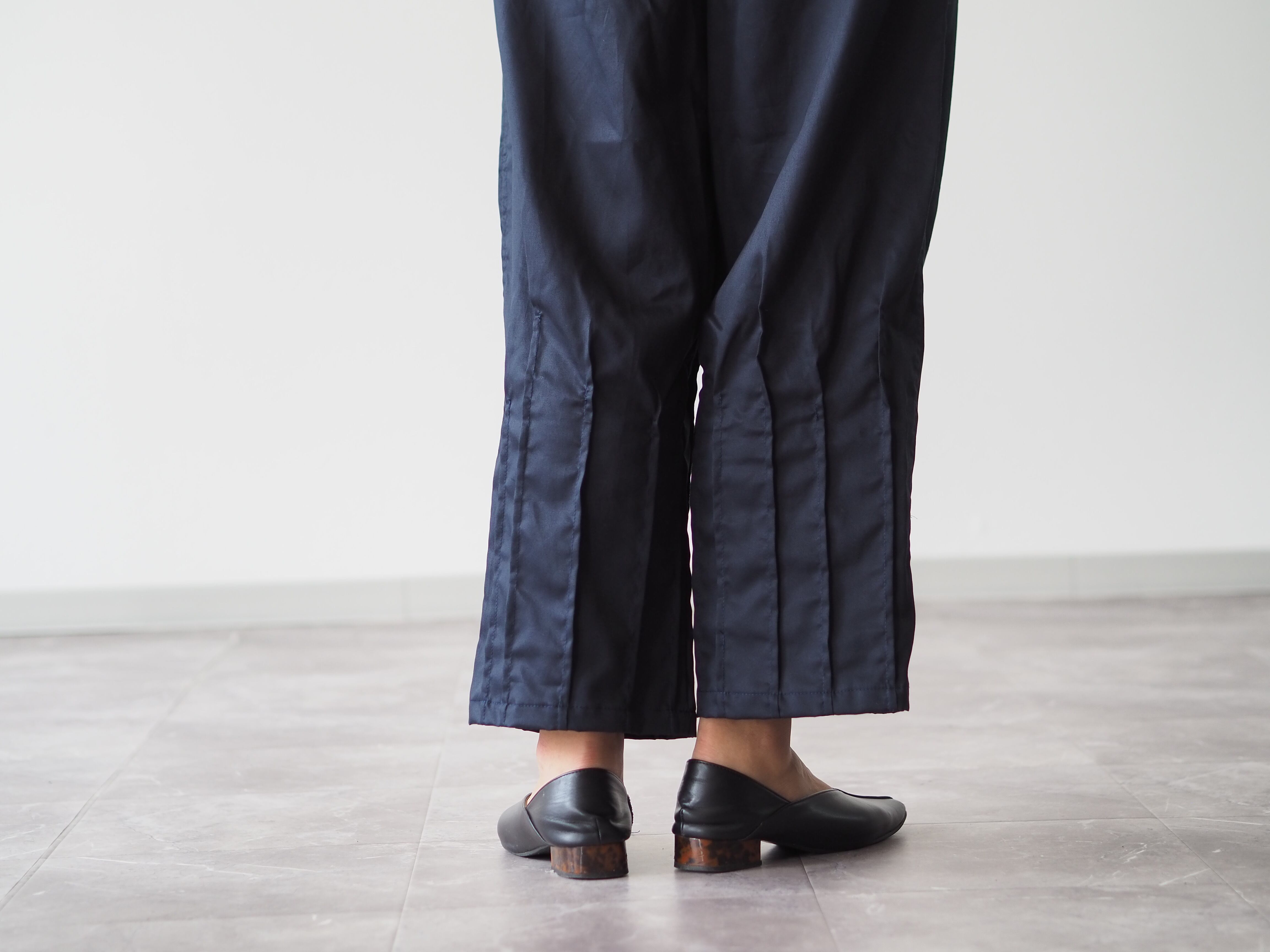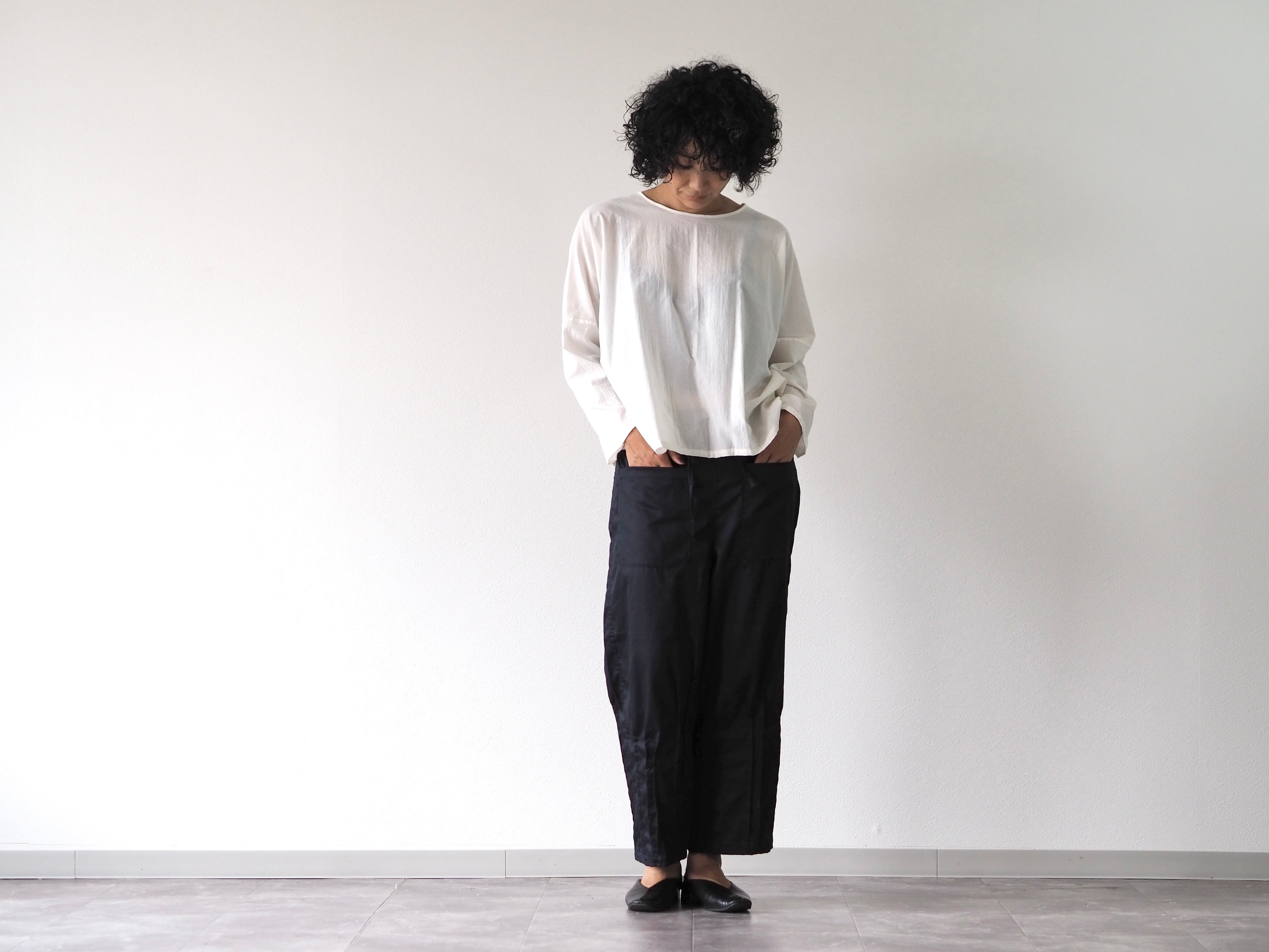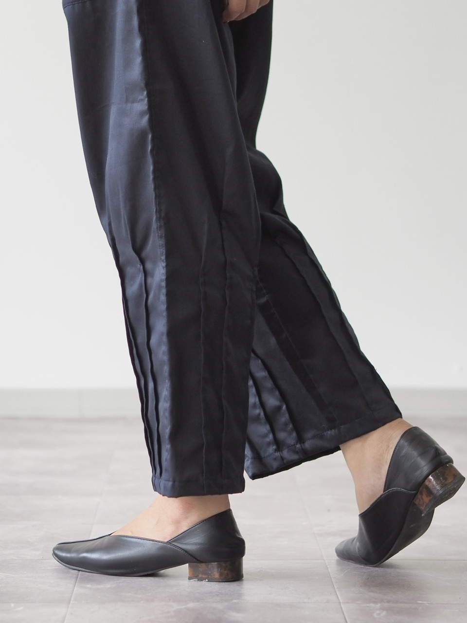 サラッと光沢のあるコットンサテンで作った、裾にピンタックが入ったパンツ。