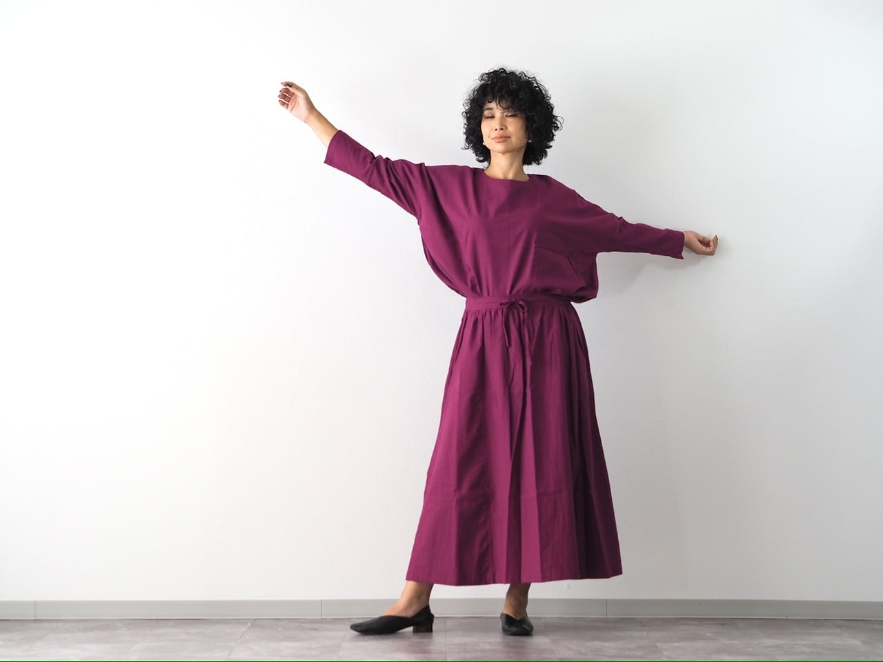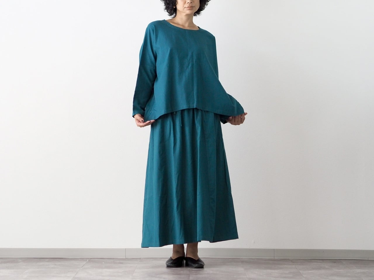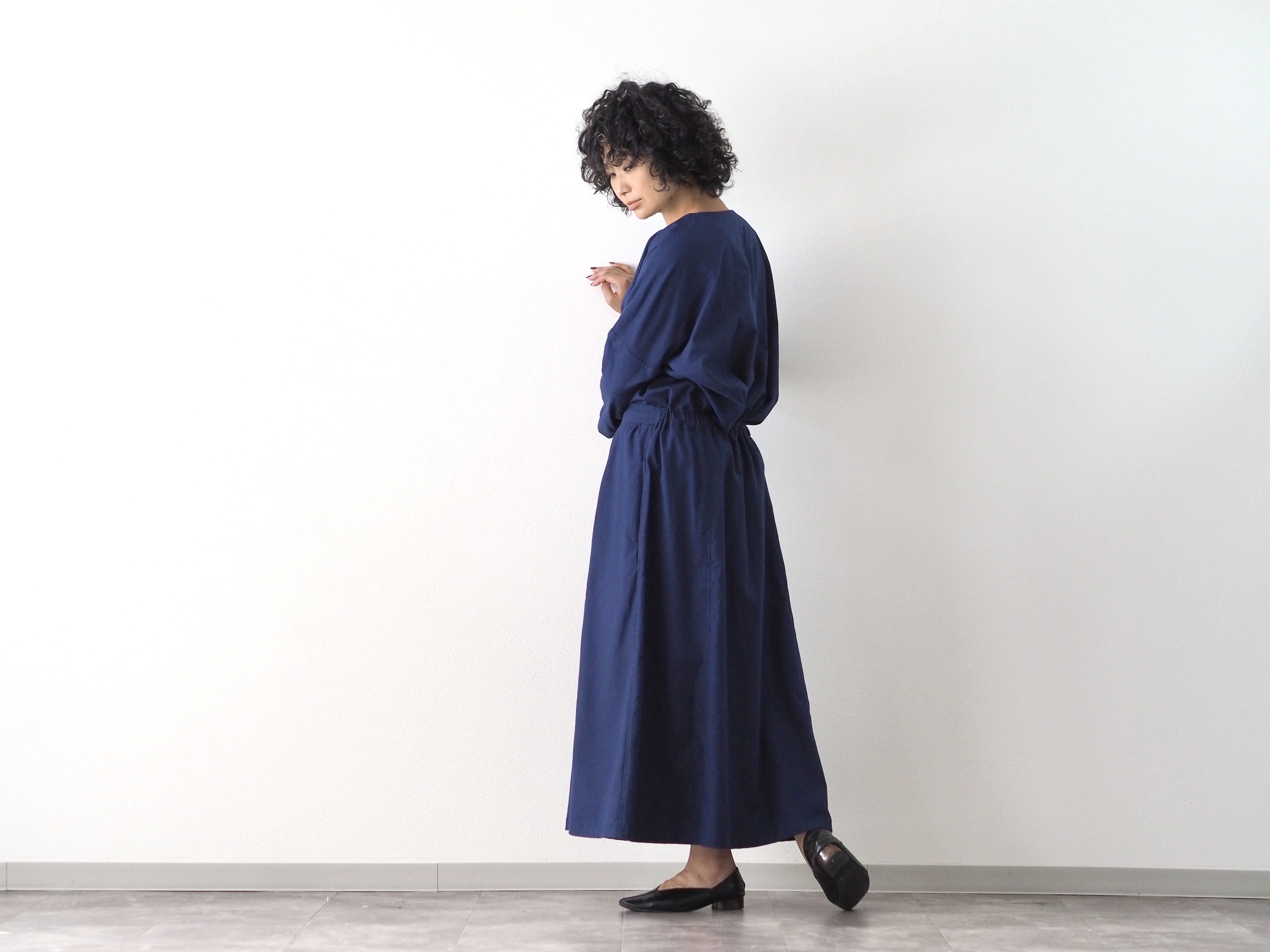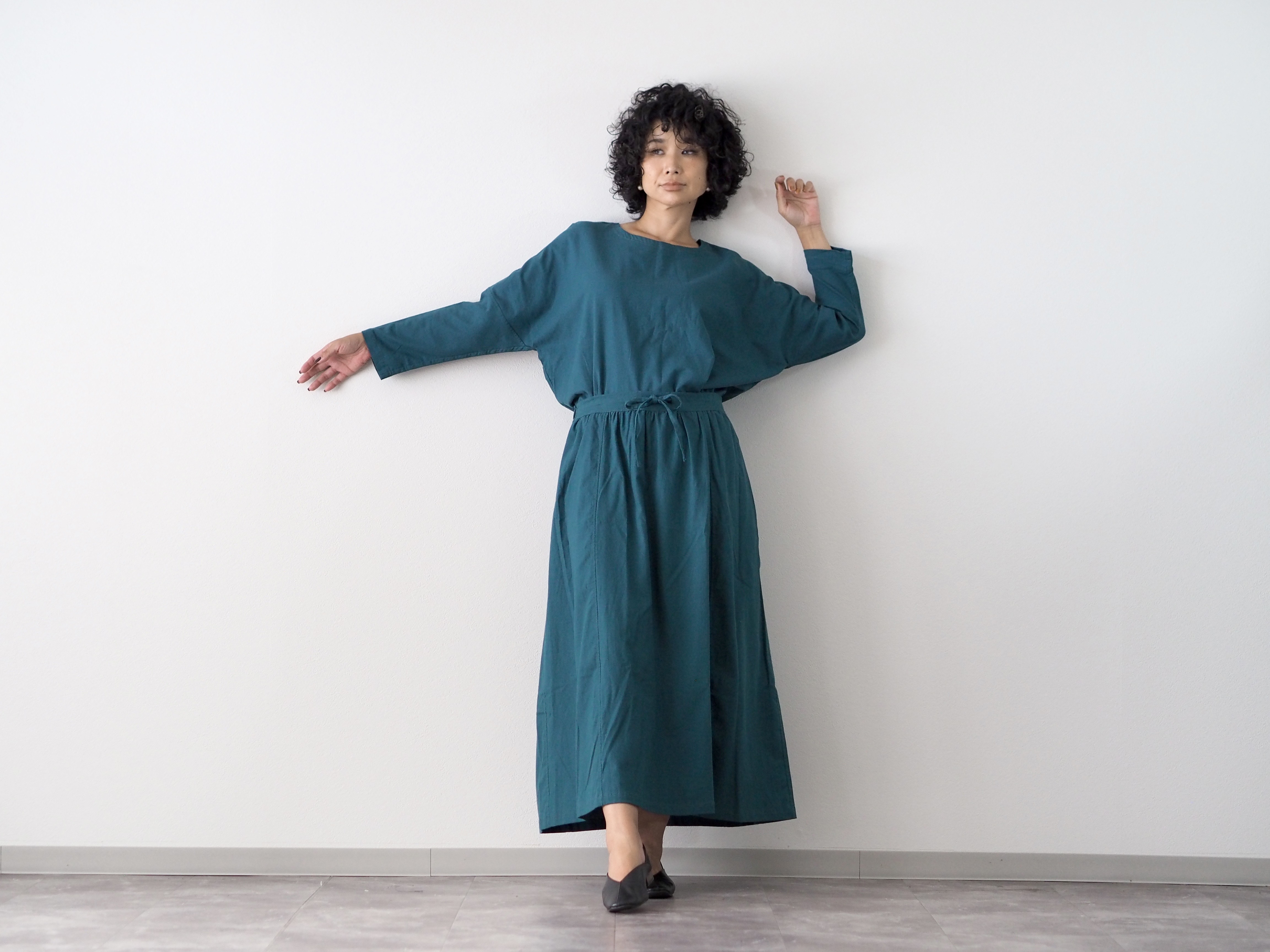 セットアップで着て、ウエストinすると、ワンピースのような着方も楽しめます。↑