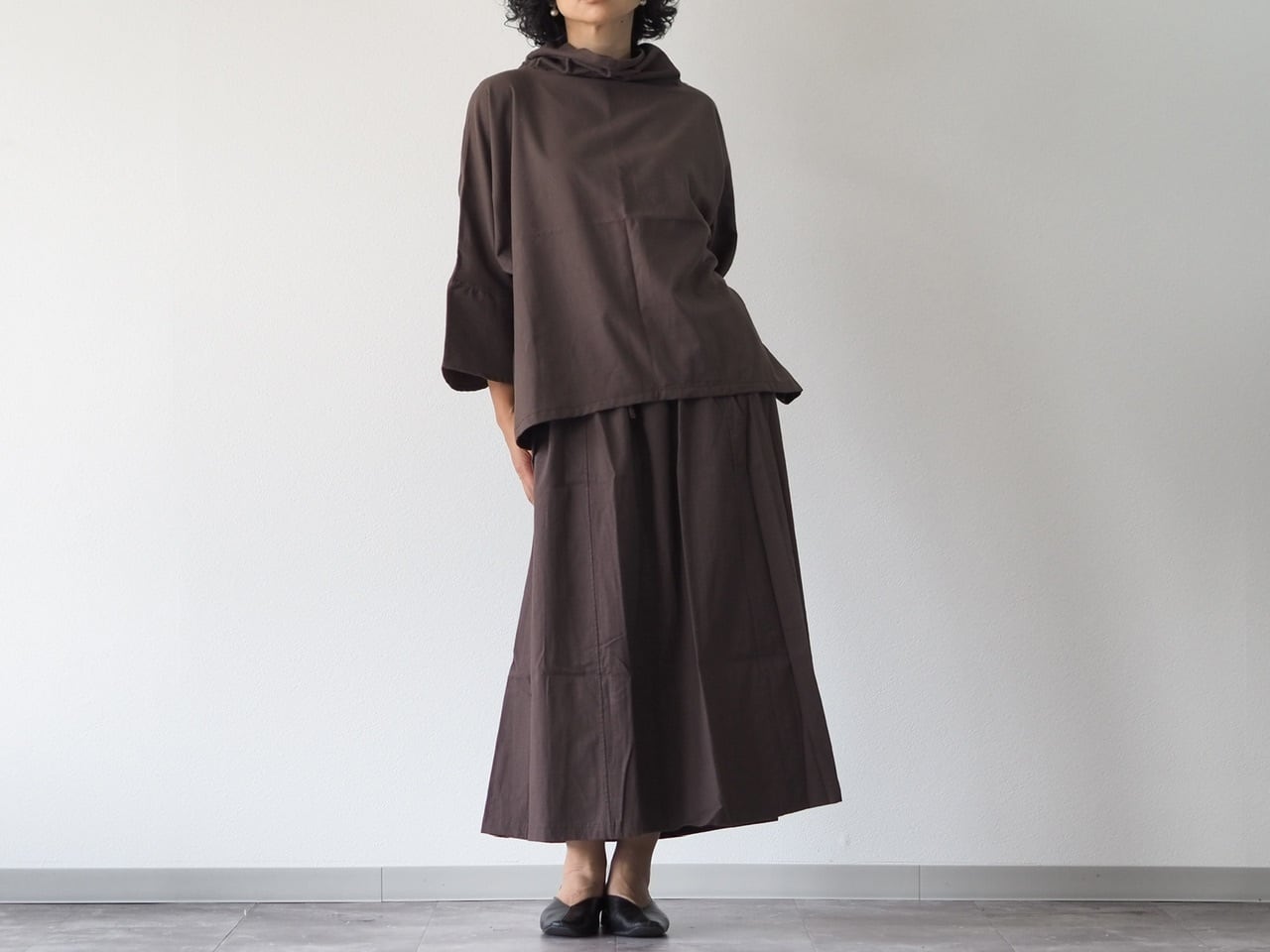 ブラウンもポンチョ風トップスとのセットのお写真となります。