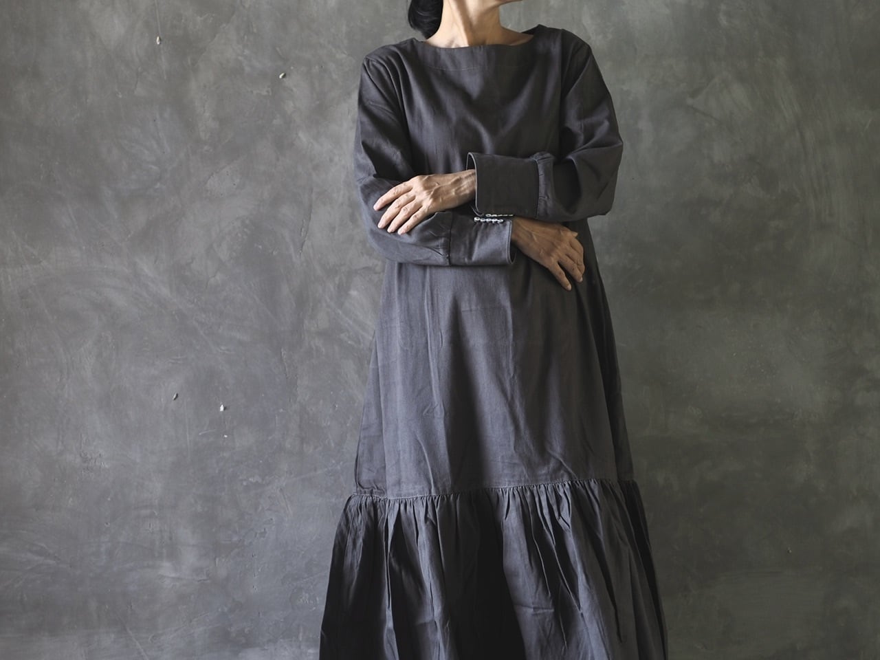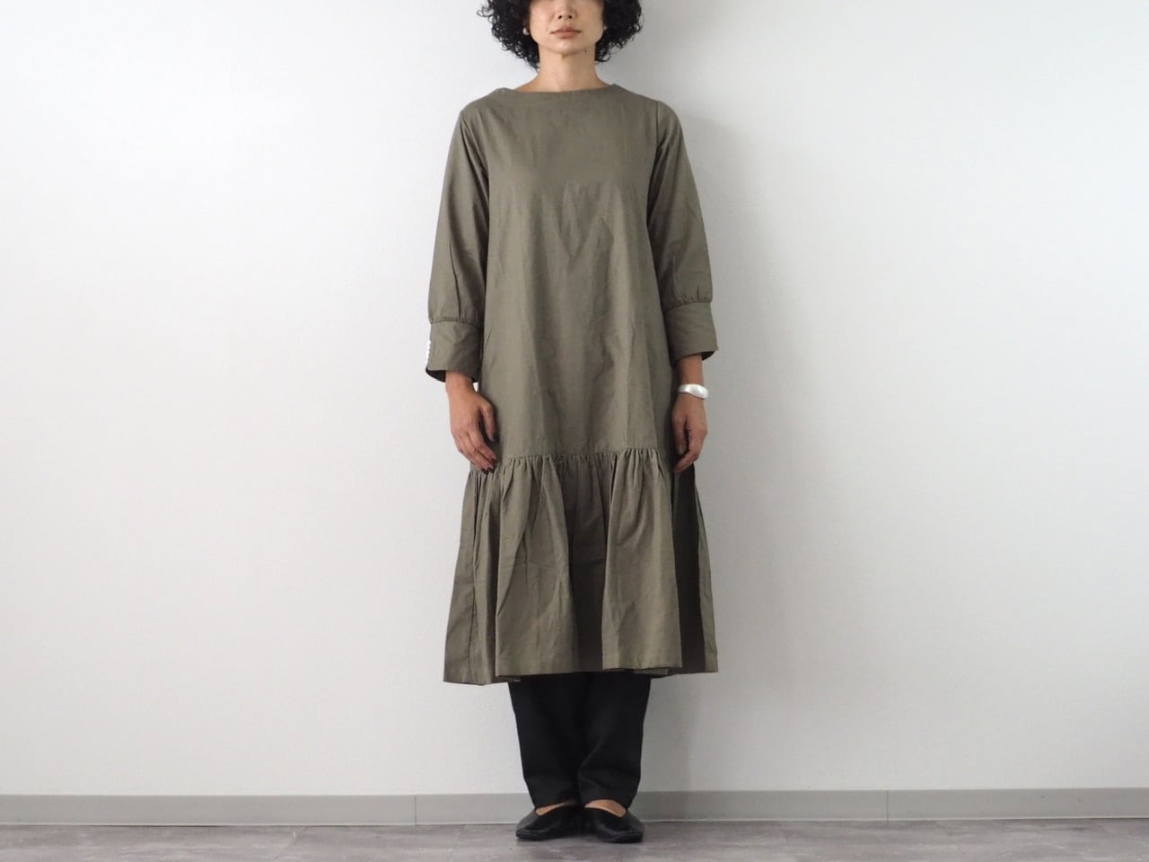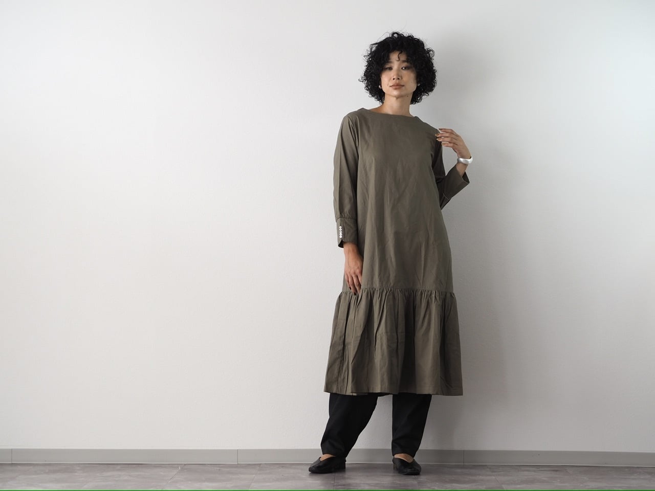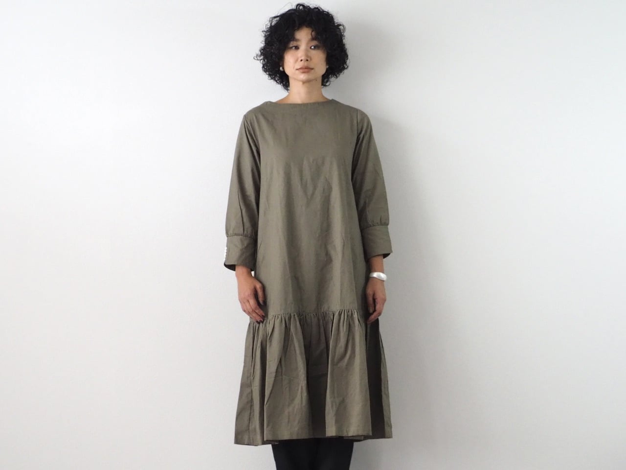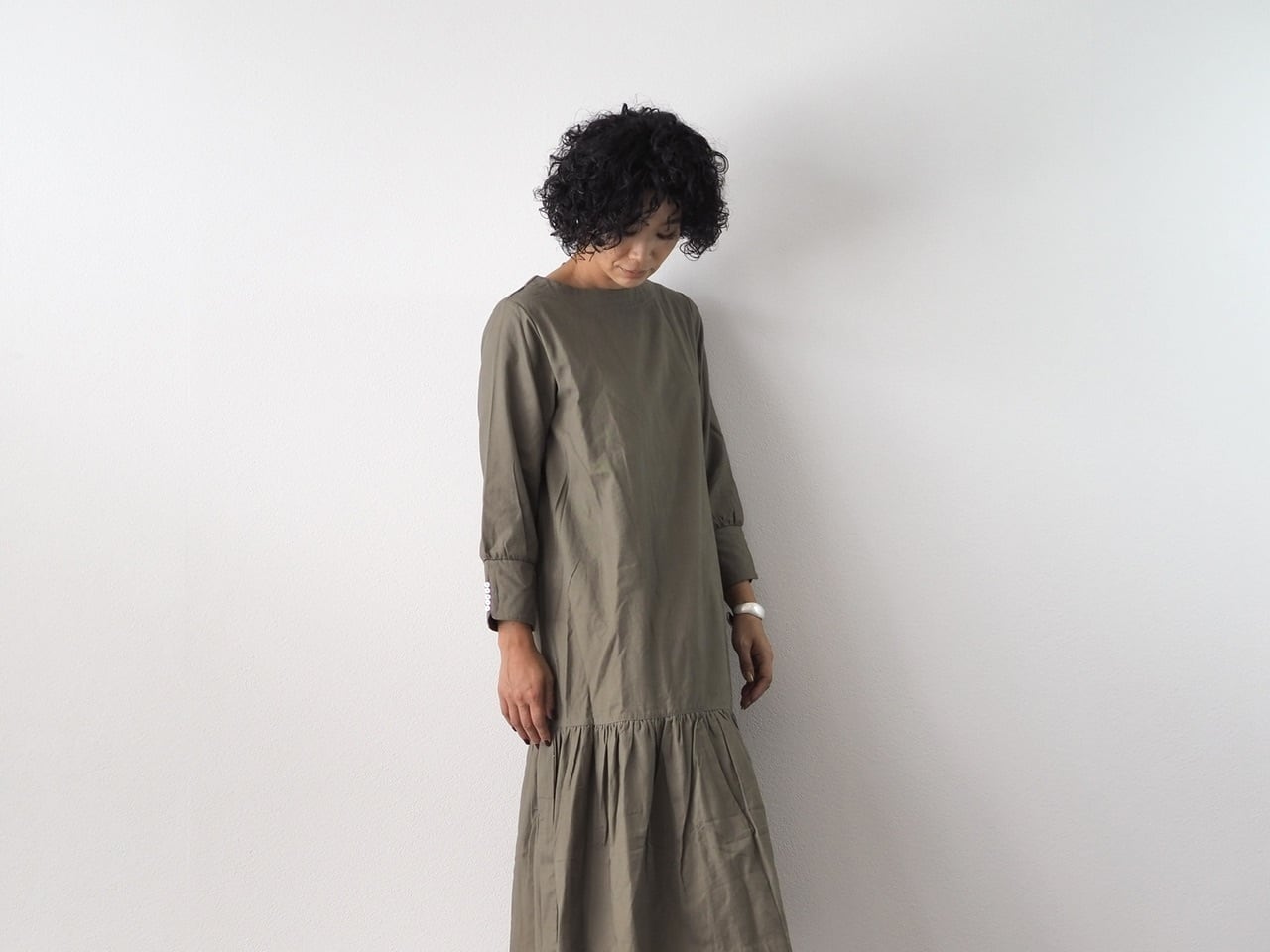 袖口に並んだ小さな貝ボタンがポイントの、ローウエストのシルエットのワンピース。ネック周りは浅めのボートネックで、袖もあまり太くせず、全体に甘くなり過ぎず、スッキリと着れるようデザインしました。
