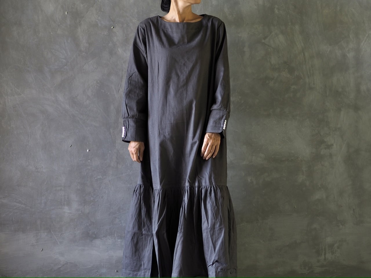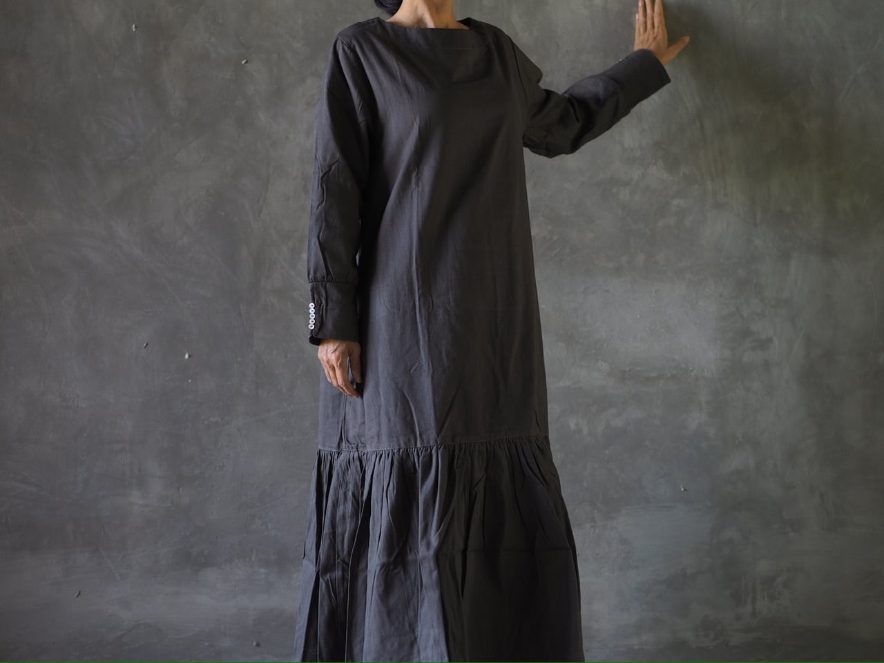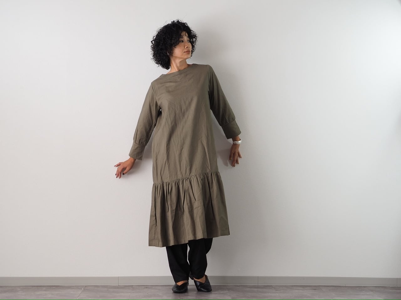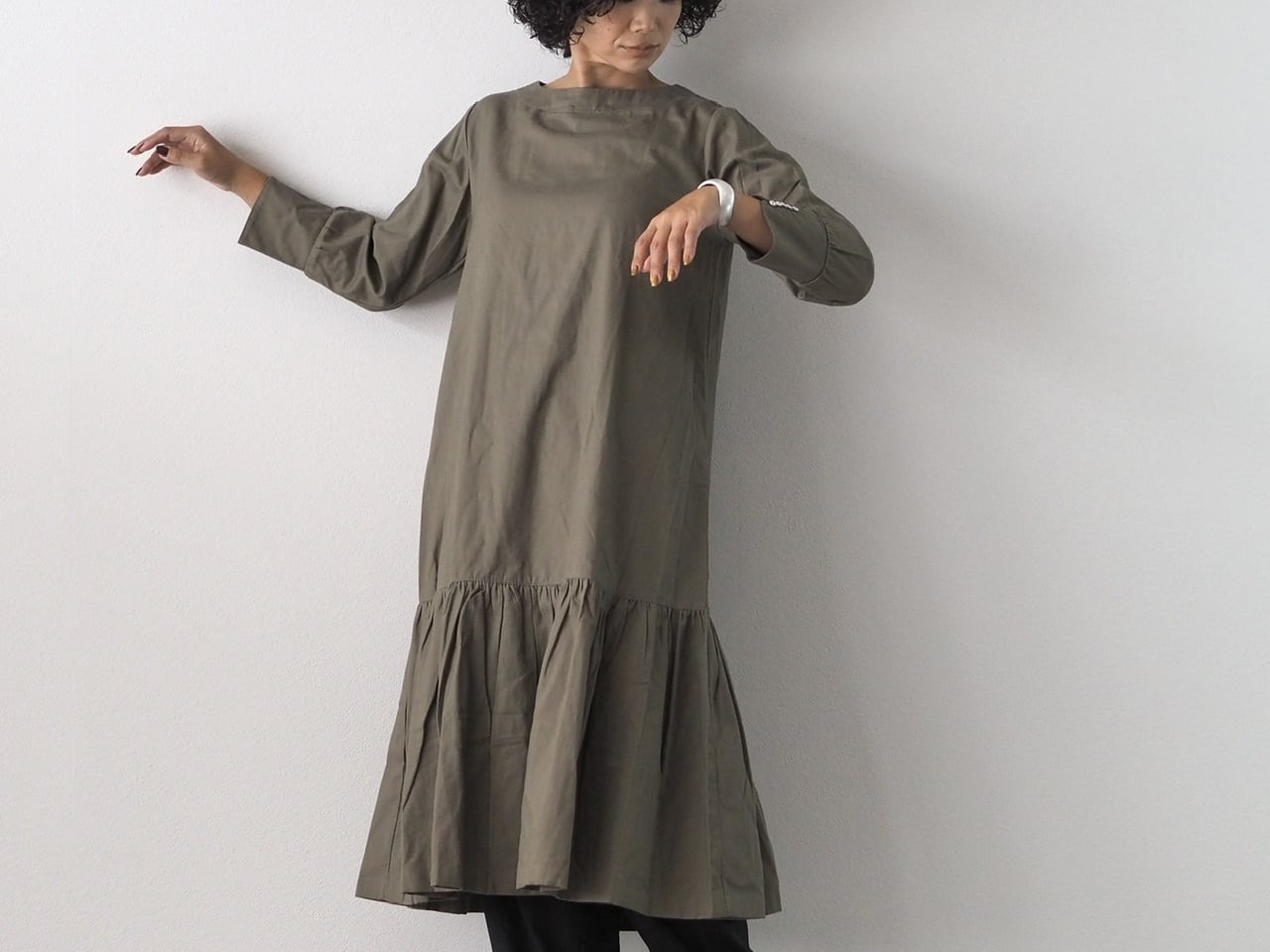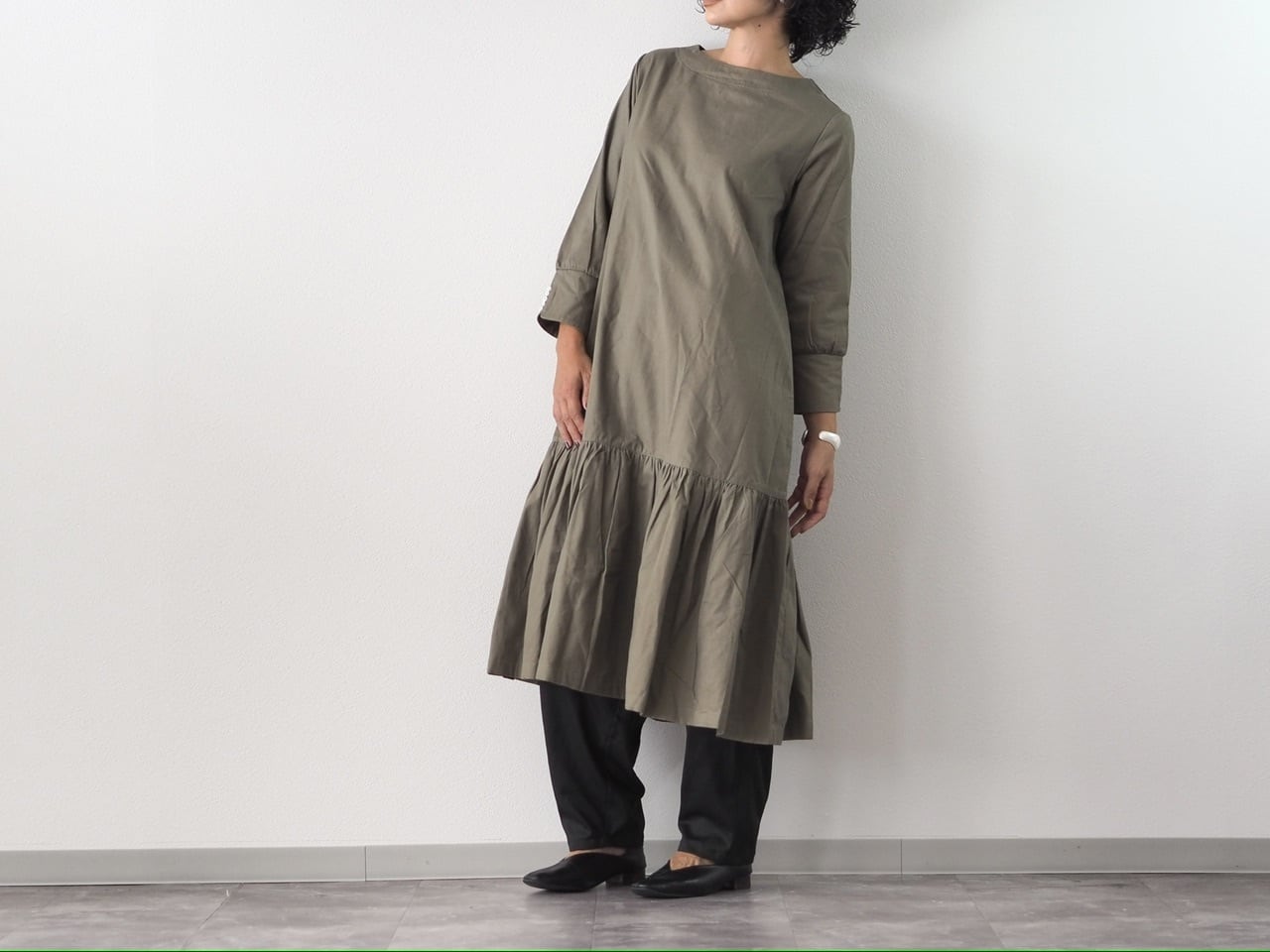 袖口に並んだ小さな貝ボタンがポイントの、ローウエストのシルエットのワンピース。ネック周りは浅めのボートネックで、袖もあまり太くせず、全体に甘くなり過ぎず、スッキリと着れるようデザインしました。