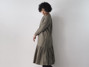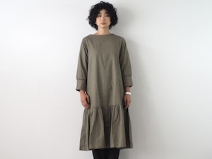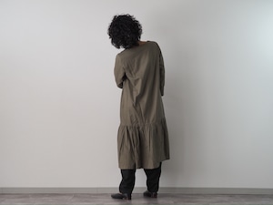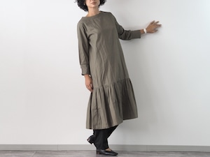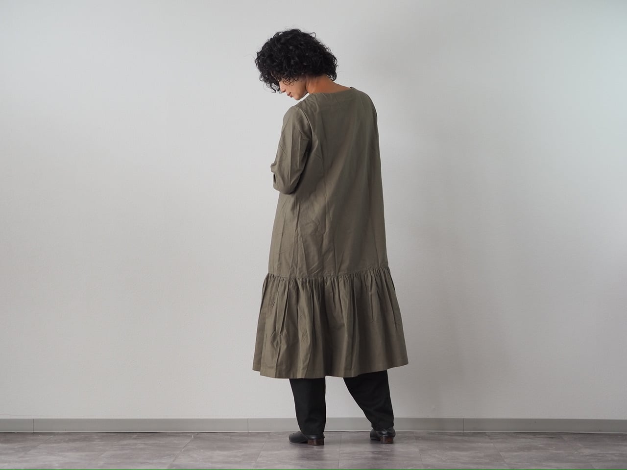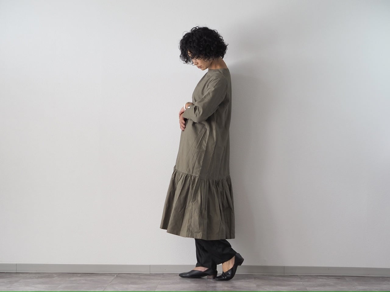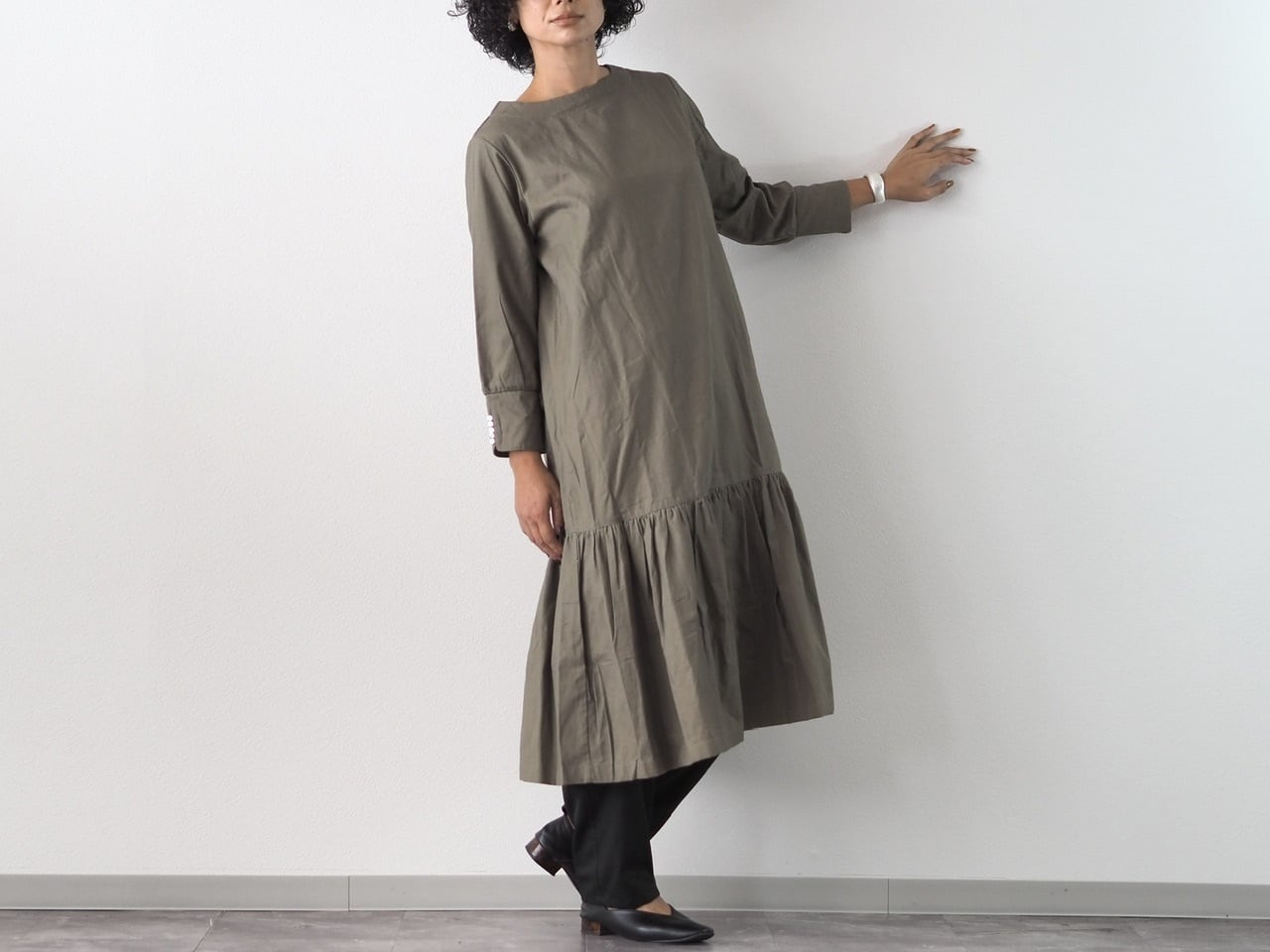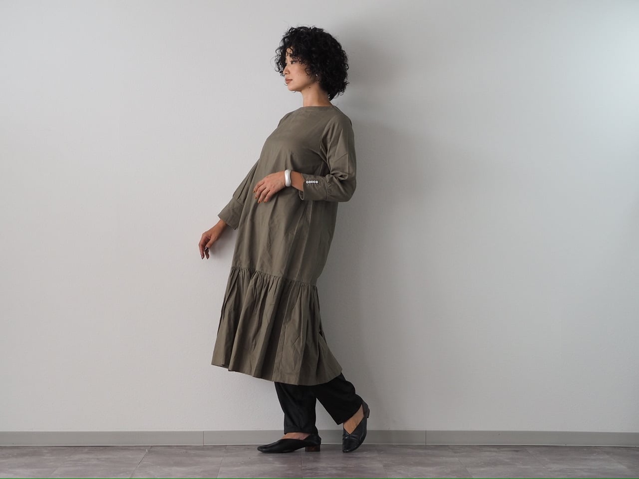 袖口に並んだ小さな貝ボタンがポイントの、ローウエストのシルエットのワンピース。ネック周りは浅めのボートネックで、袖もあまり太くせず、全体に甘くなり過ぎず、スッキリと着れるようデザインしました。