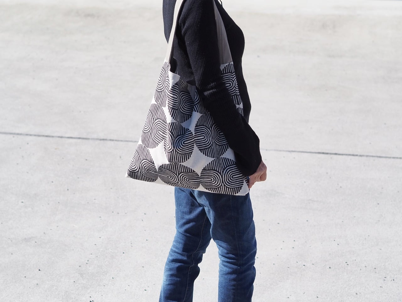 完成した一枚の布から出来上がったバッグは、それぞれに一点ものです。