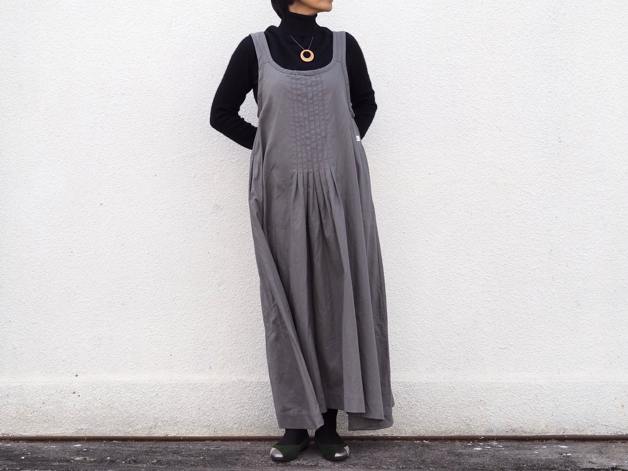 マキシ丈。タックの入ったテントラインワンピース/グレー