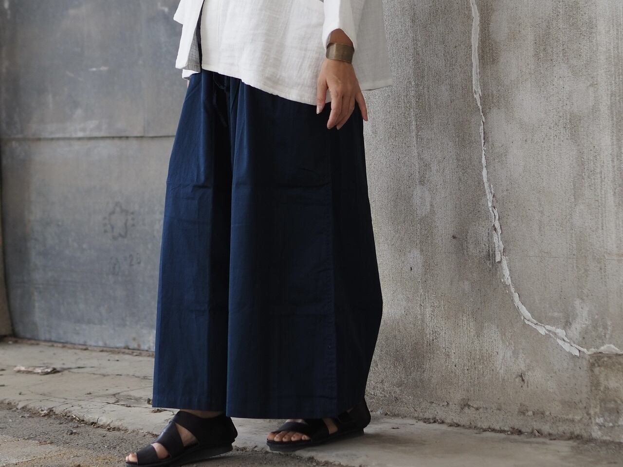 ウエストゴムの無いパンツやスカートが好きなのですが、畳んで紐で結わえるタイパンツのような作りですと、動いているうちに形が変わってしまったりするのがちょっと…と思い、サイドで紐を引っ張って巾着の口のように絞り、残りの紐は二重から三重、腰にくるくると巻いて結わえるワイドパンツにしました。