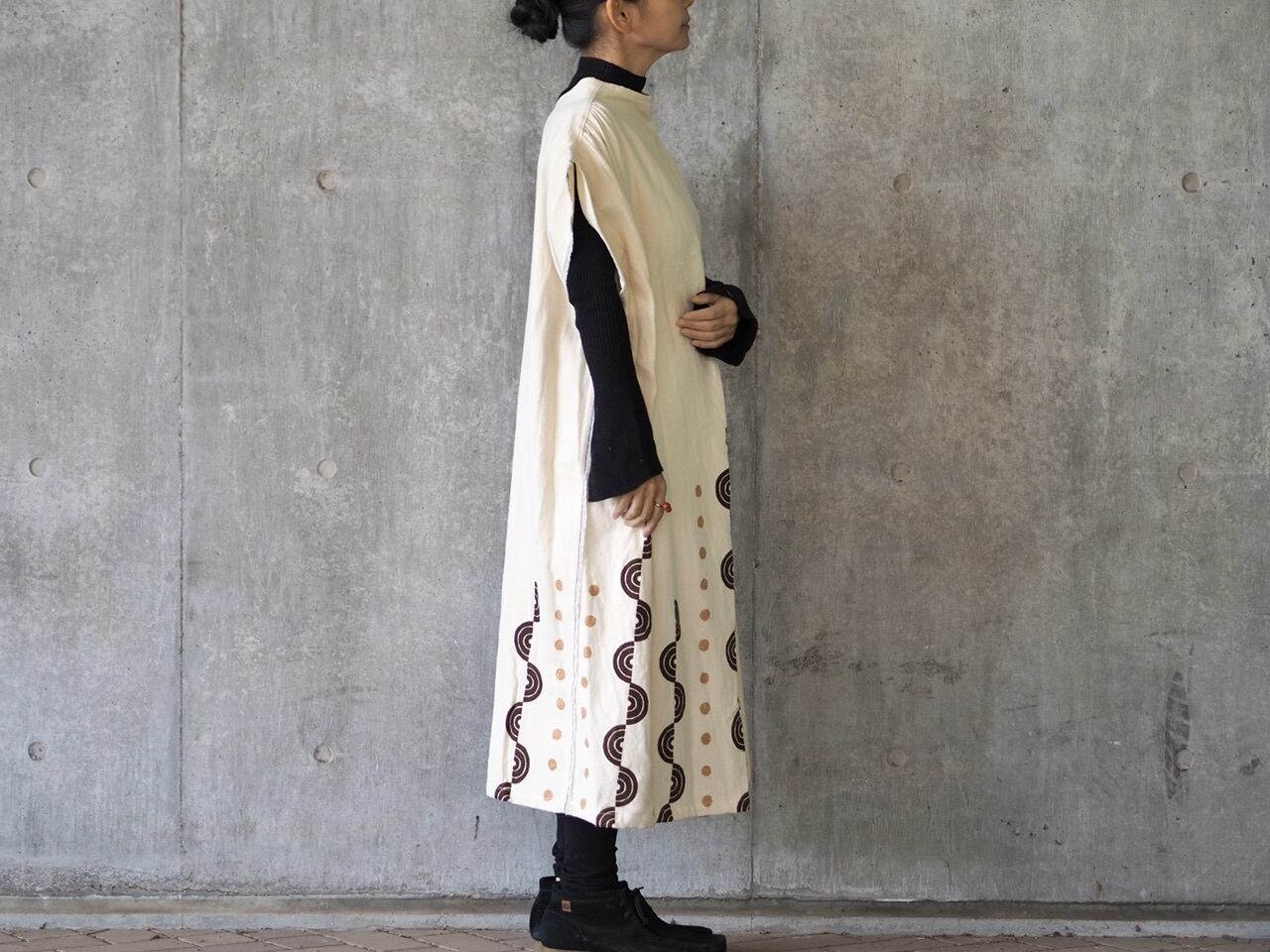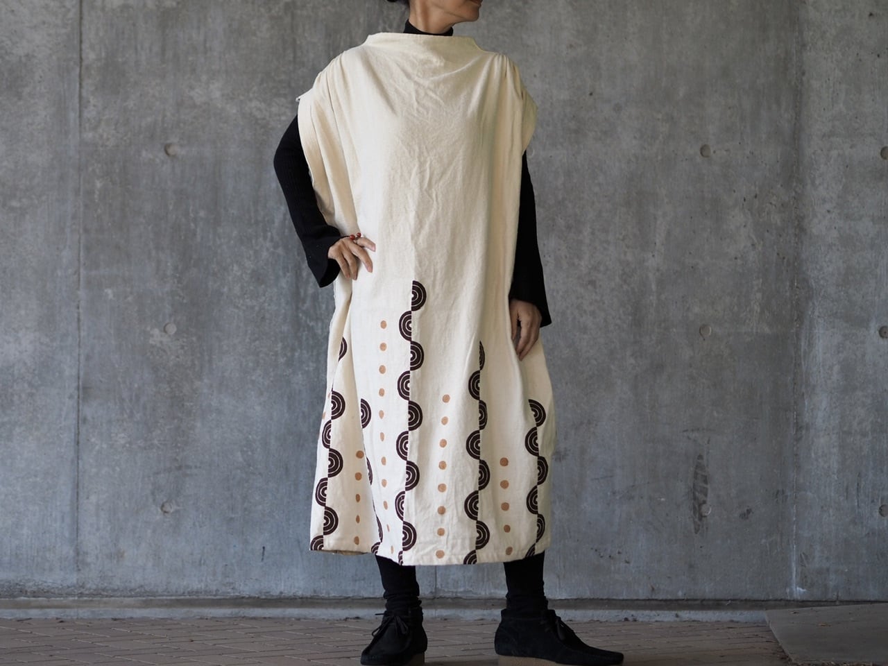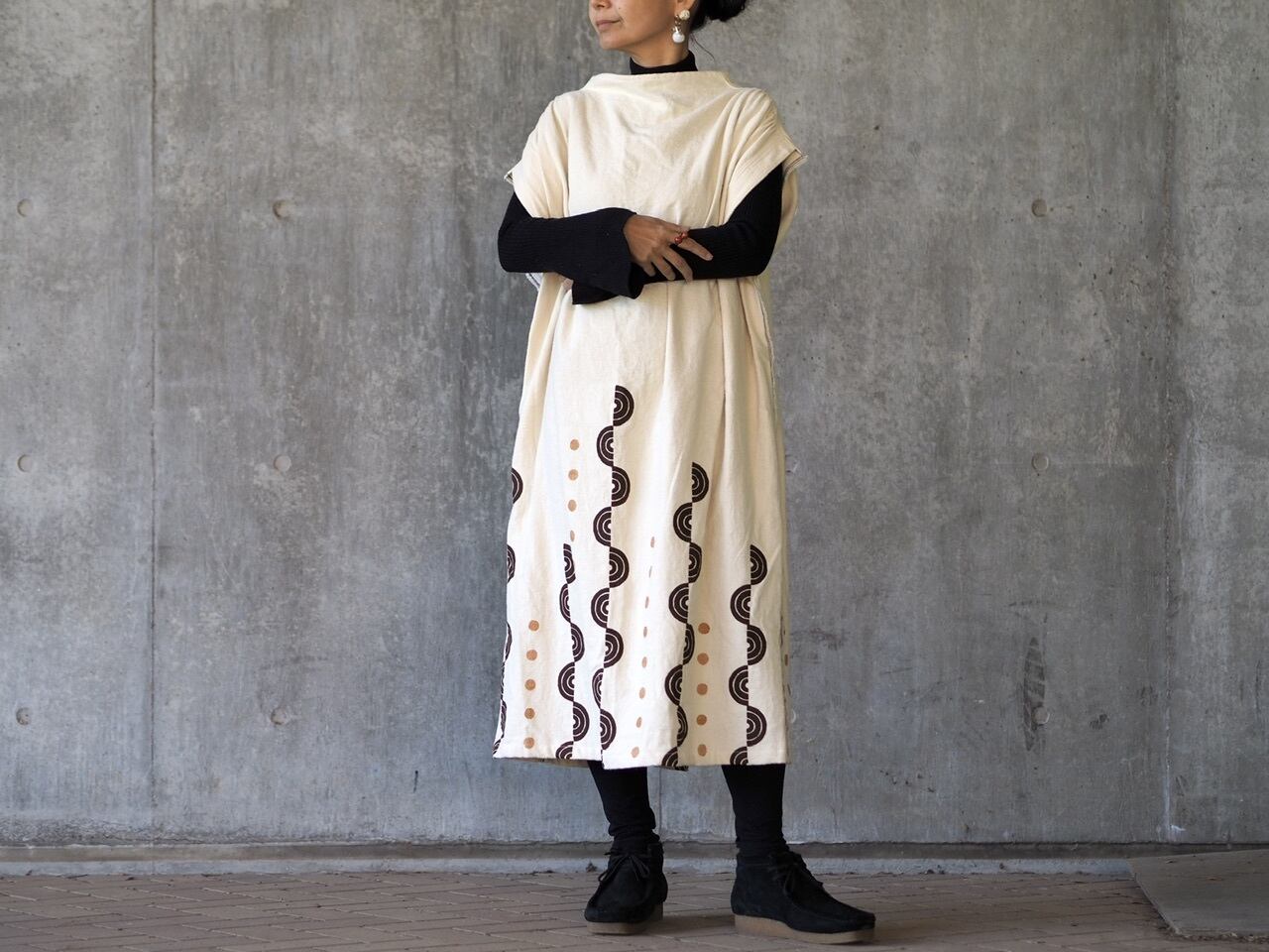 ブロックプリント/ハーフネック、スリット入りワンピース