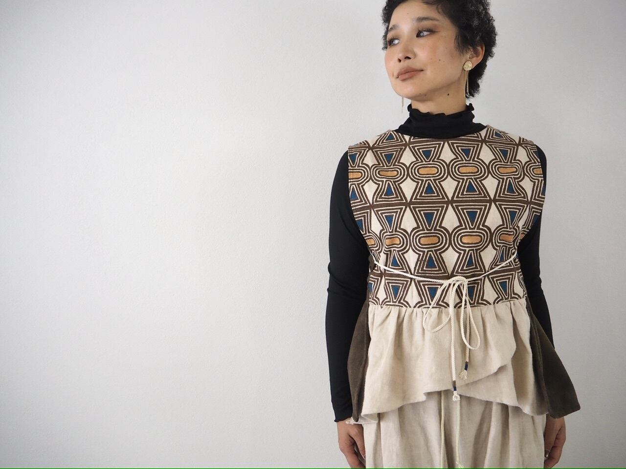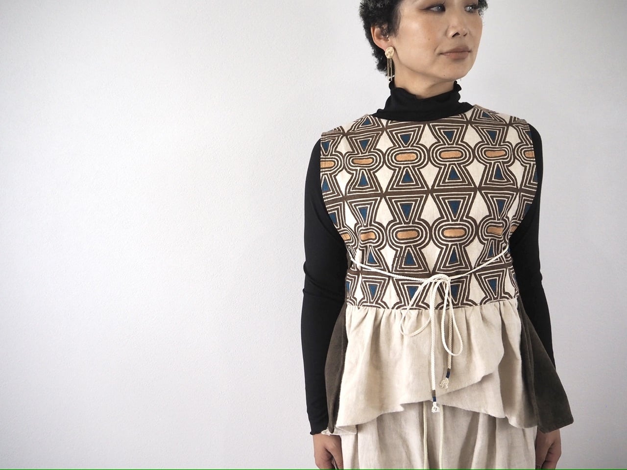 ブロックプリントの文様が際立つ、ユニークな形のベスト。