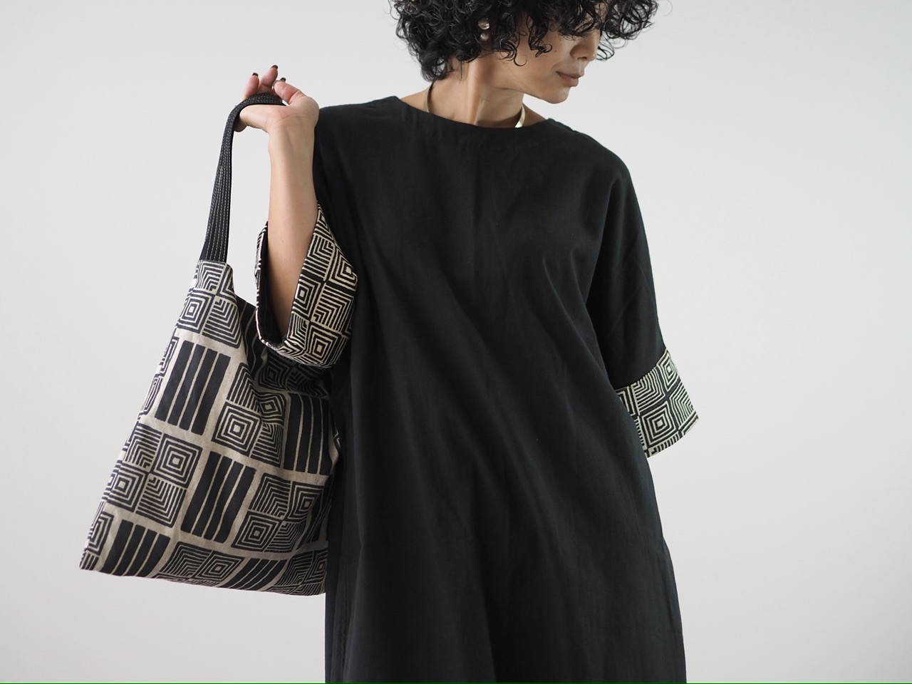 ブロックプリントで作った幾何学模様の布で幅広なお袖がポイントです。