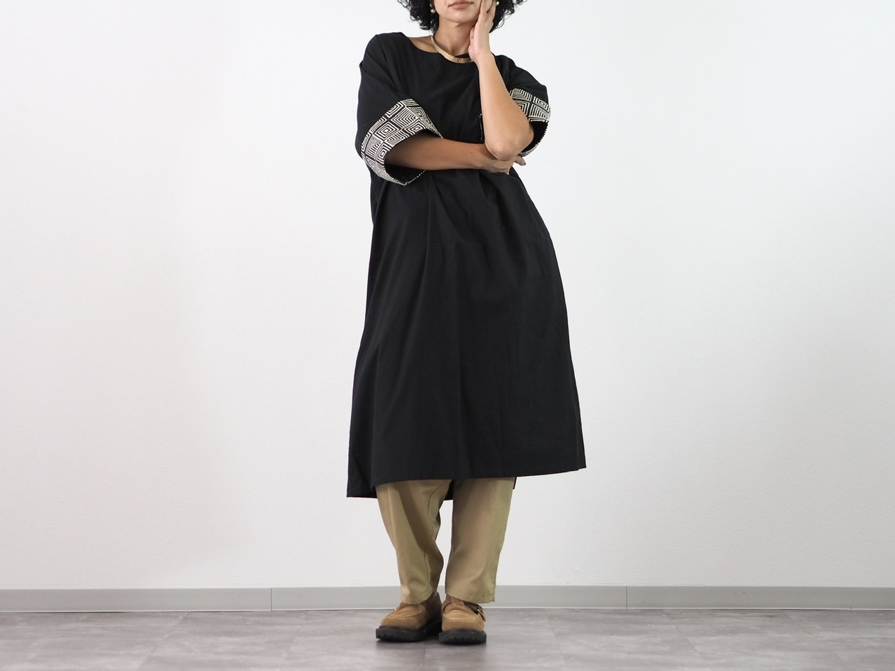 ストンとしたシルエットのシンプルなワンピース。