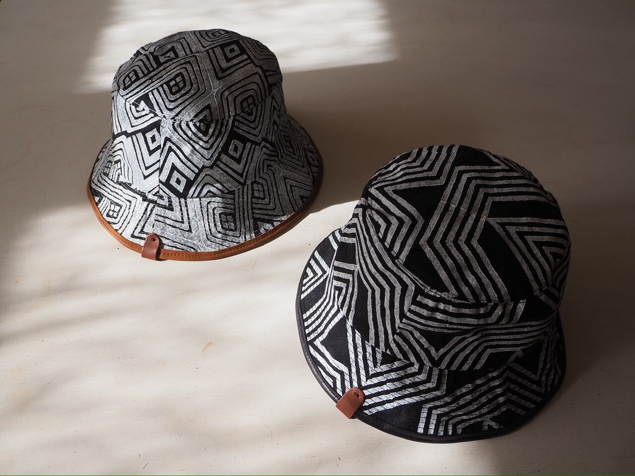 ブラックのリネン生地にホワイトの幾何学文様が浮かび上がる、バケットハット。