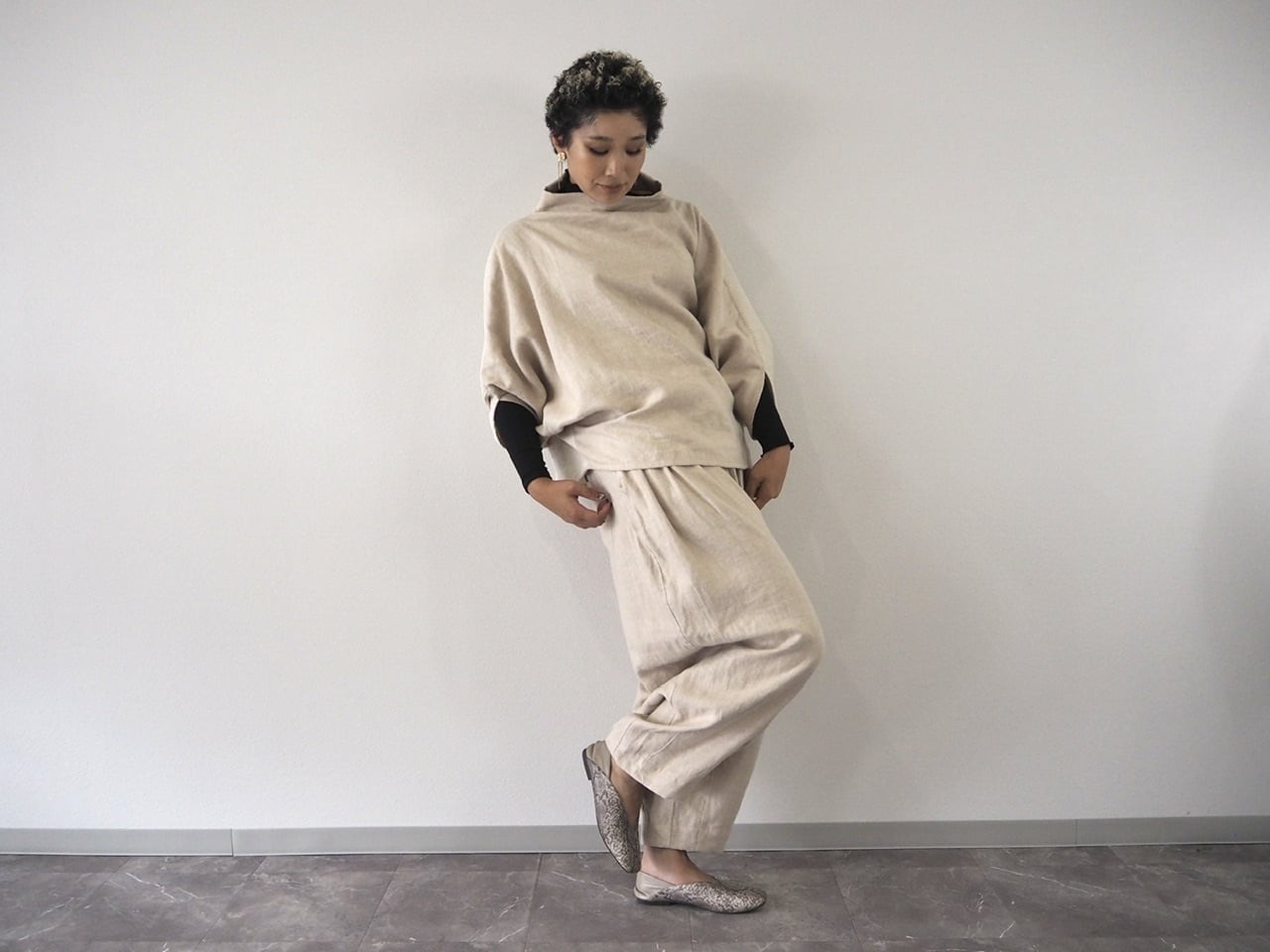 コーデュロイと起毛リネン、前後どちら側からも着れるユニークな形のトップスです。ヤッコさんのようにすっぽりとかぶって着られ、